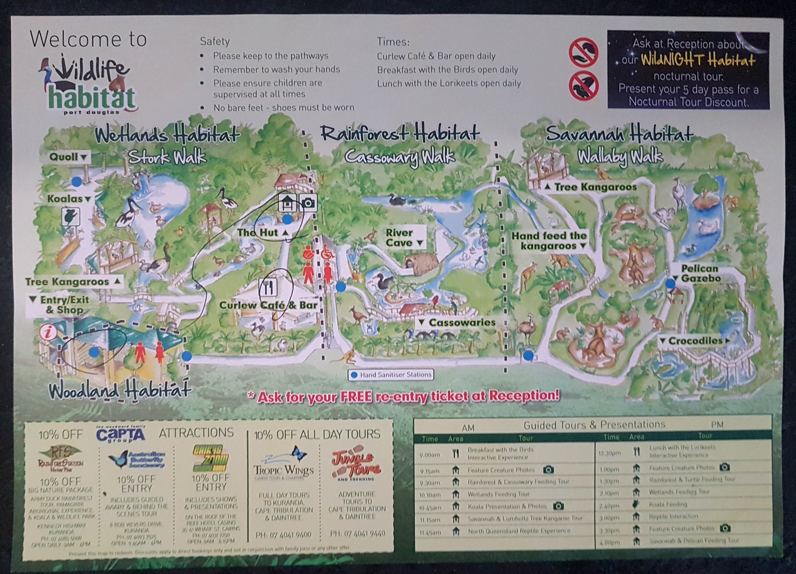 On a pris un billet combiné pour ce parc et celui des crocodiles (Hartley’s) qu’on a croisé sur la route entre Cairns et Port Douglas qu’on a l’intention de visiter sur le retour. Le total est de 67,50$ au lieu de 75$ avec une entrée libre et permanente au Wildlife Habitat pendant 5 jours!!!