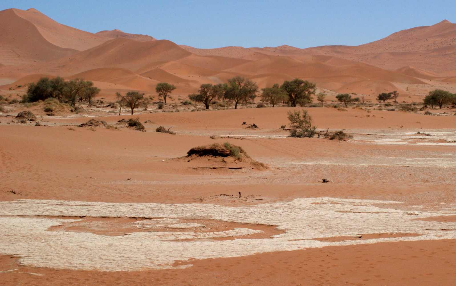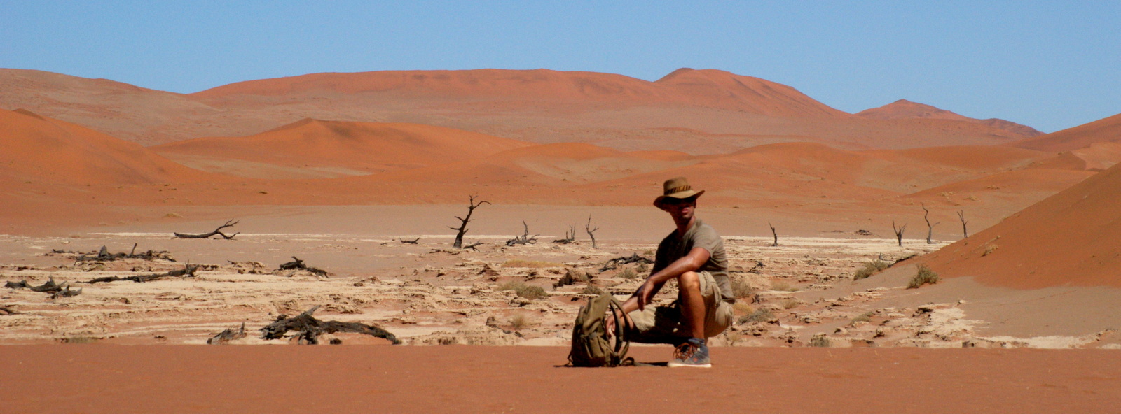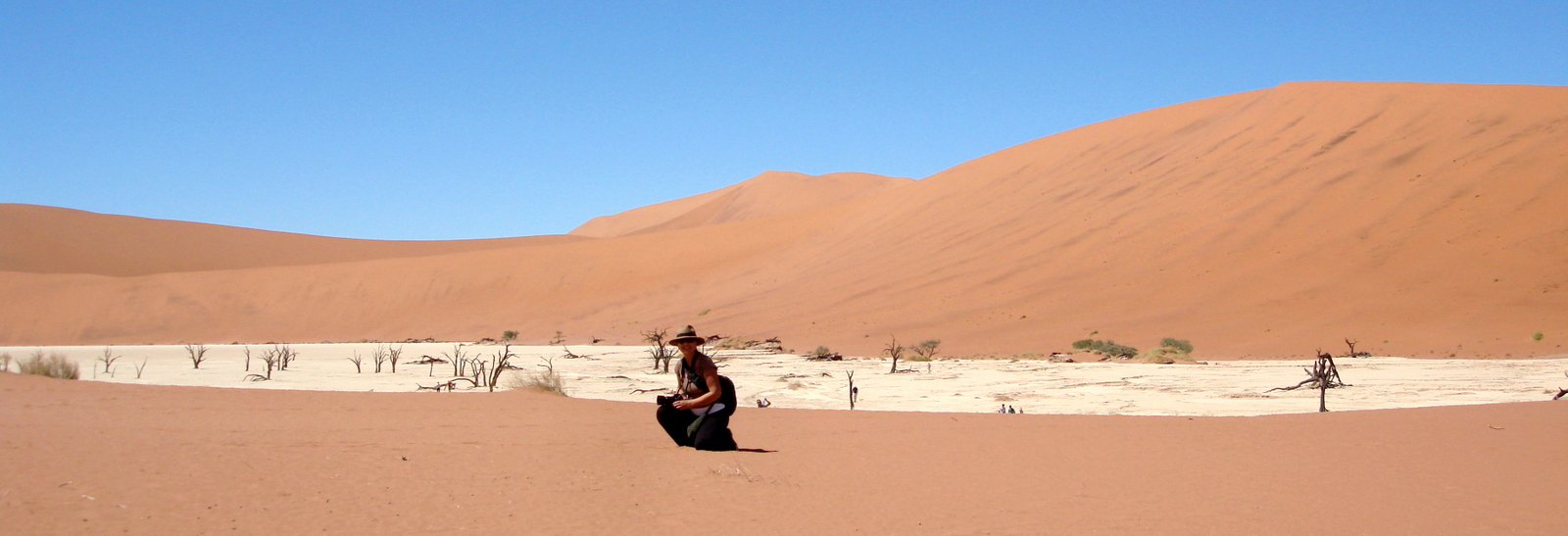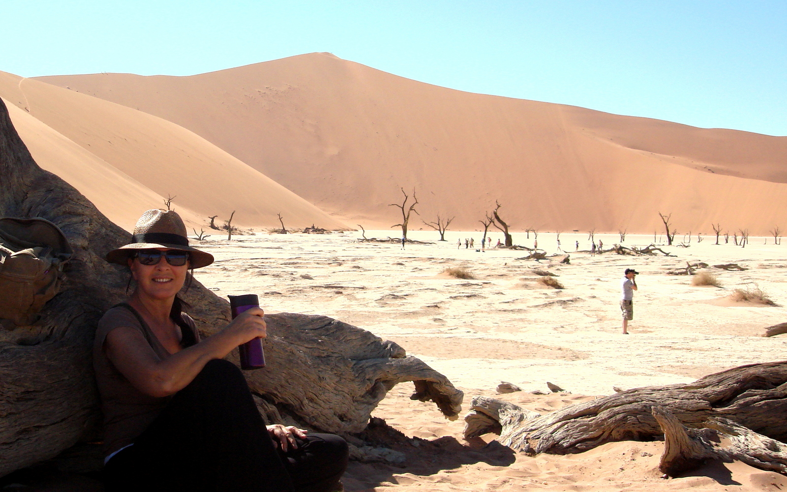 Perso, je n’irai pas jusqu’en haut… et je préfère descendre dans le Deadvlei oû les couleurs sont magnifiques… Ce mélange de ciel bleu azur, de sable rouge, d’argile blanche et d’arbres noirs est vraiment magnifique et très très photogénique… On s’installe à l’ombre d’un arbre et on contemple pendant un long moment ce paysage irréel… Il fait très très chaud quand on se décide enfin à partir, trop chaud pour grimper Big Mama (300m) et puis je n’ai déjà pas réussi Bid Daddy alors…