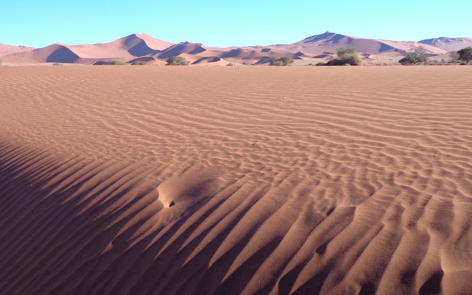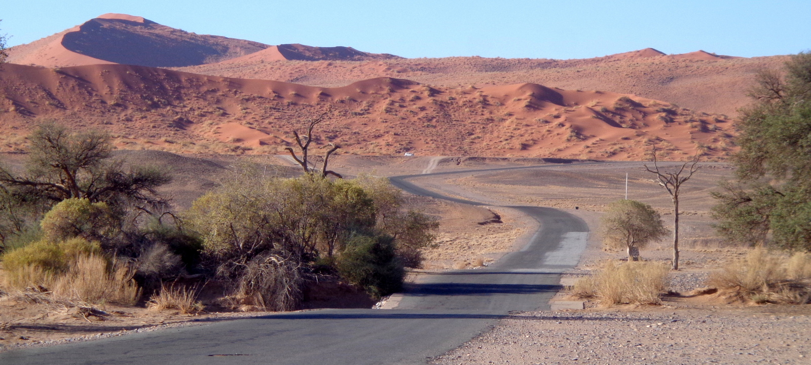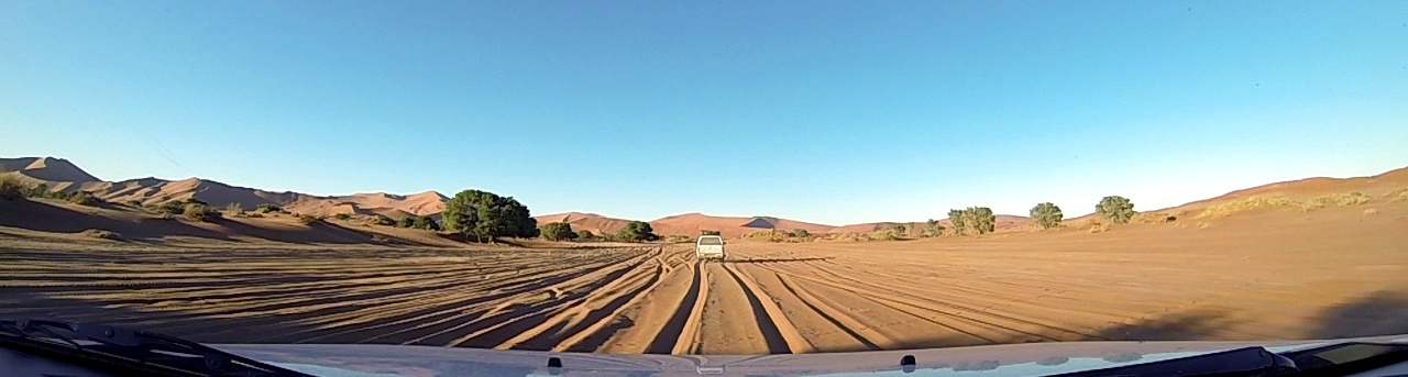 Il fait encore nuit quand après un bon café, on prend la route direction les fameuses dunes du Sossusvlei. A peine sortis du camp, on croise un guépard qui chasse !!!