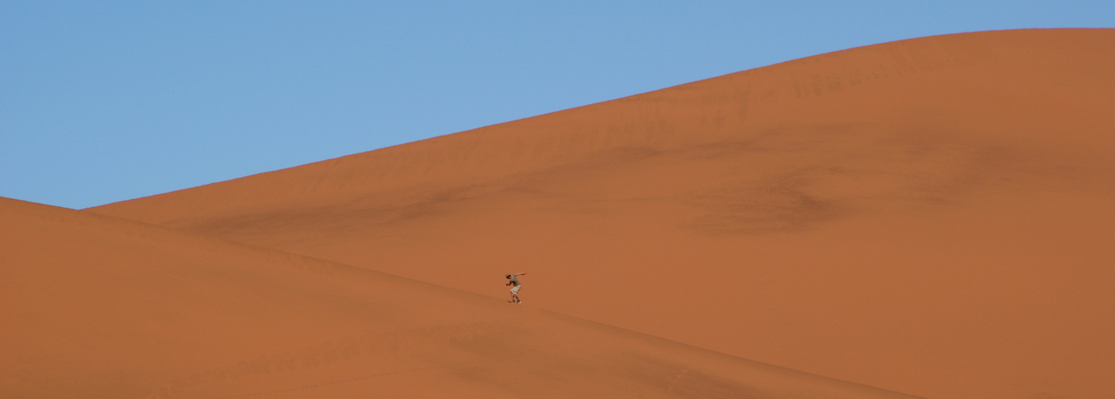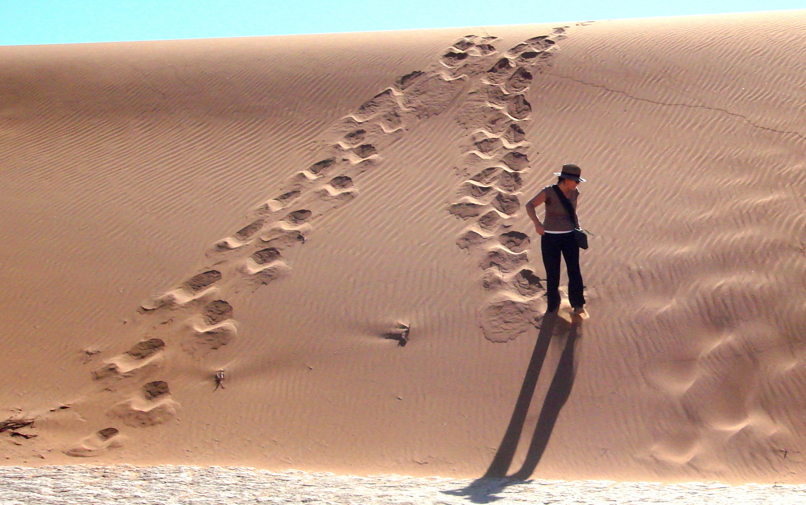 L’ascension de Big Daddy (325m) est difficile si on n’est pas en grande forme physique: on marche sur une crête dure qui tord les chevilles, on a vite les chaussures qui pèsent avec tout le sable dedans et on recule régulièrement dans le sable qui coule…
