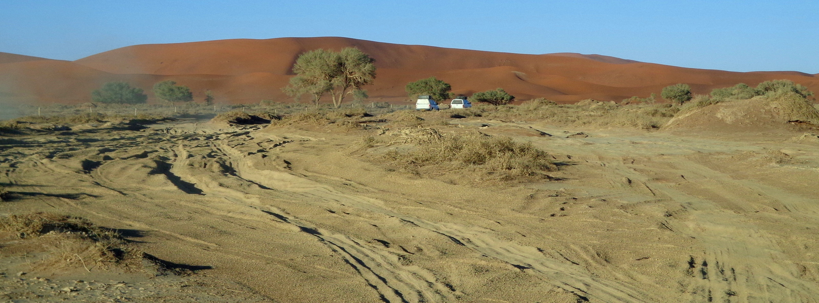 Après avoir dégonflé les pneus (recommandé..), on se lance dans du sable super mou. C’est assurément une expérience de conduite… D’ailleurs, il vaut mieux laisser une bonne distance avec le 4X4 qui est devant car on ne peut pas le dépasser et s’il s’arrête ou ne sait pas conduire dans le sable, il vous mettra aussi en difficulté… ce qui nous est arrivé avec un espagnol qui s’est ensablé. Heureusement qu’il y avait une plaque de sable dur sur laquelle on a pu se garer et repartir!