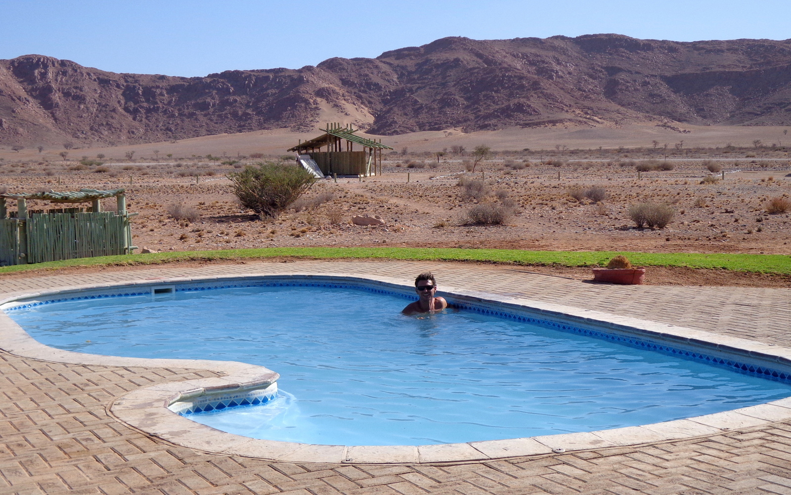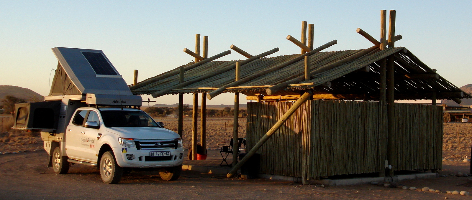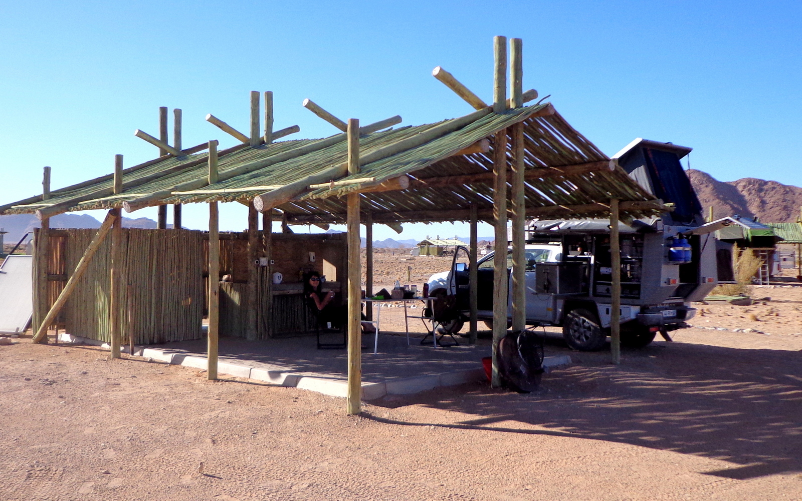 On a demandé un emplacement face à l’ouest pour le coucher de soleil et c’était une erreur car un vent d’ouest très fort s’est levé assez vite nous empêchant de manger sur la terrasse. Il faut donc privilégier un emplacement face à l’est pour se protéger et profiter de la soirée… Emplacement= 180 NAD/ personne (environ 11€)
