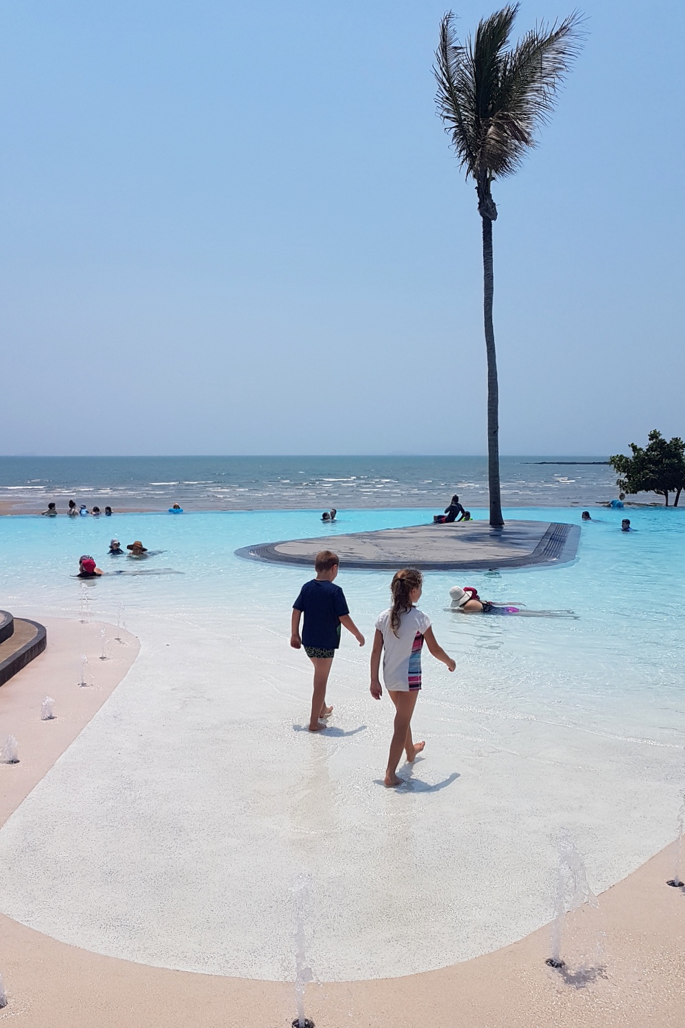 3) Se baigner dans le LAGON. Tout nouveau, il a ouvert en mai 2018, il a une superficie de 2500 m2 de style balinais avec une île et un palmier en plein milieu !!! Il est ouvert tous les jours de 6h00 à 21h00 en été et de 8h00 à 18h00 en hiver (de mai à aout). Assurément très très photogénique, j’ai trouvé malheureusement que l’eau y était un peu fraîche pour la frileuse que je suis… On peut y manger dans un grand coffee-shop…