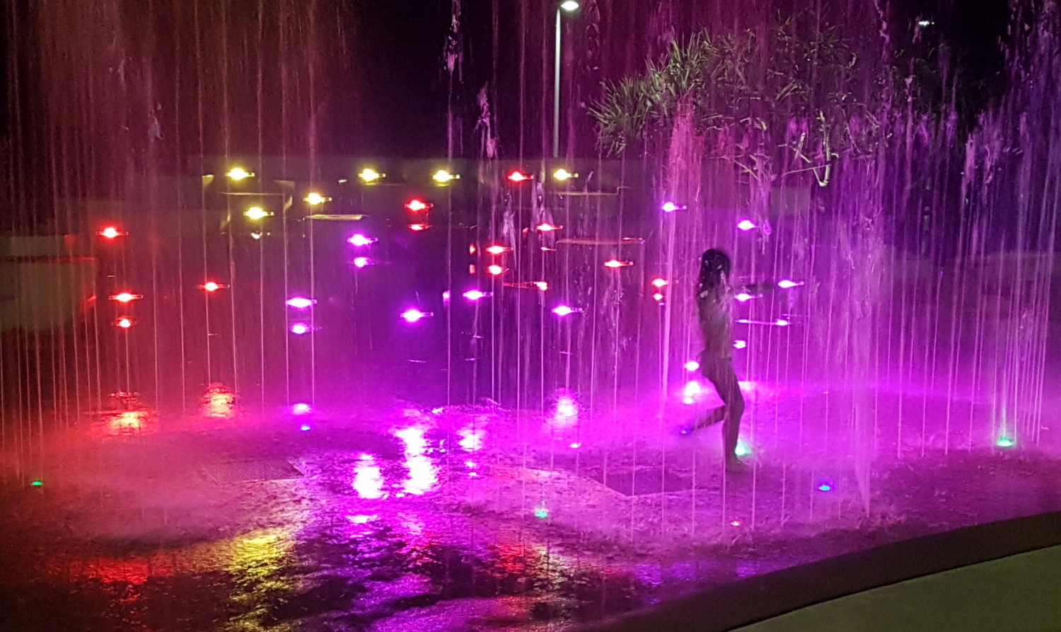 5) Se promener sur l’esplanade qui est superbement aménagée avec un « théâtre romain » qui change de couleur, une aire de jeux pour les enfants (le Kraken) avec des « monstres » en mosaïque et des jets d’eau et de lumières, de nombreuses toilettes d’une propreté irréprochable, des transats en métal et bois fixés face à la mer, des tables-bancs-barbecues pour pique-niquer…