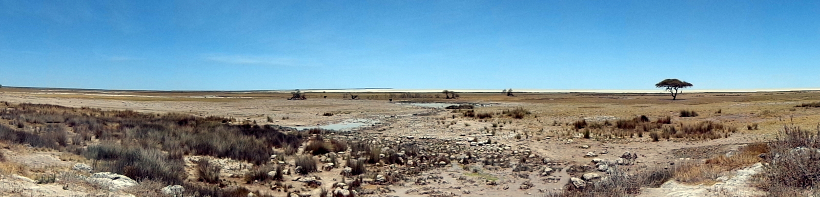 Comme c’est assez proche, on fait toutes les boucles en s’arrêtant longtemps aux points d’eau. Il faut dire aussi que c’est sûrement à cet endroit que le paysage est le plus spectaculaire. Le PAN, un lac desséché qui est devenu un désert de sel brille de mille feux en cette saison sèche. Il parait qu’en saison humide, il reflète comme un miroir quand il est inondé… tout comme le DEADVLEI, d’ailleurs!