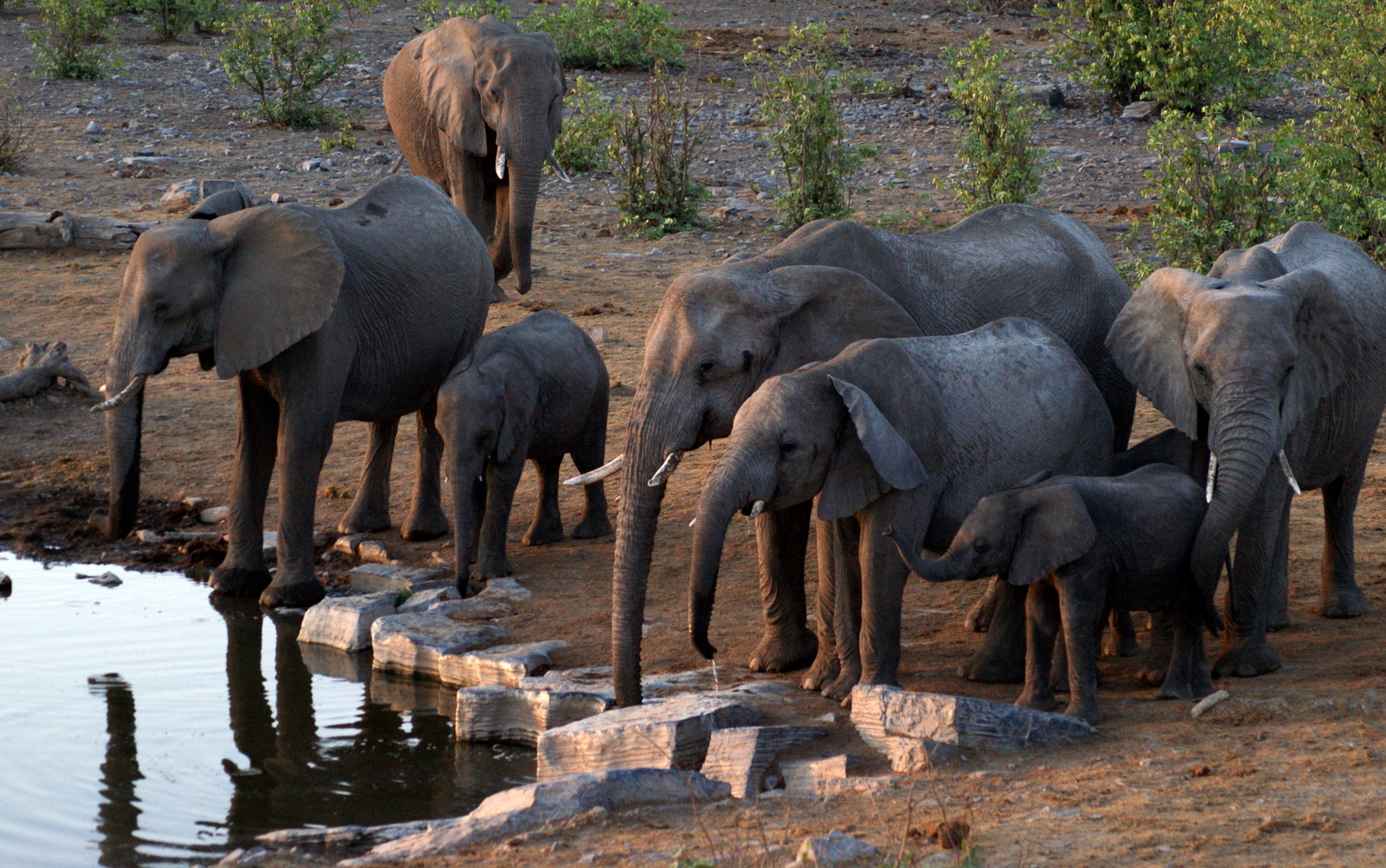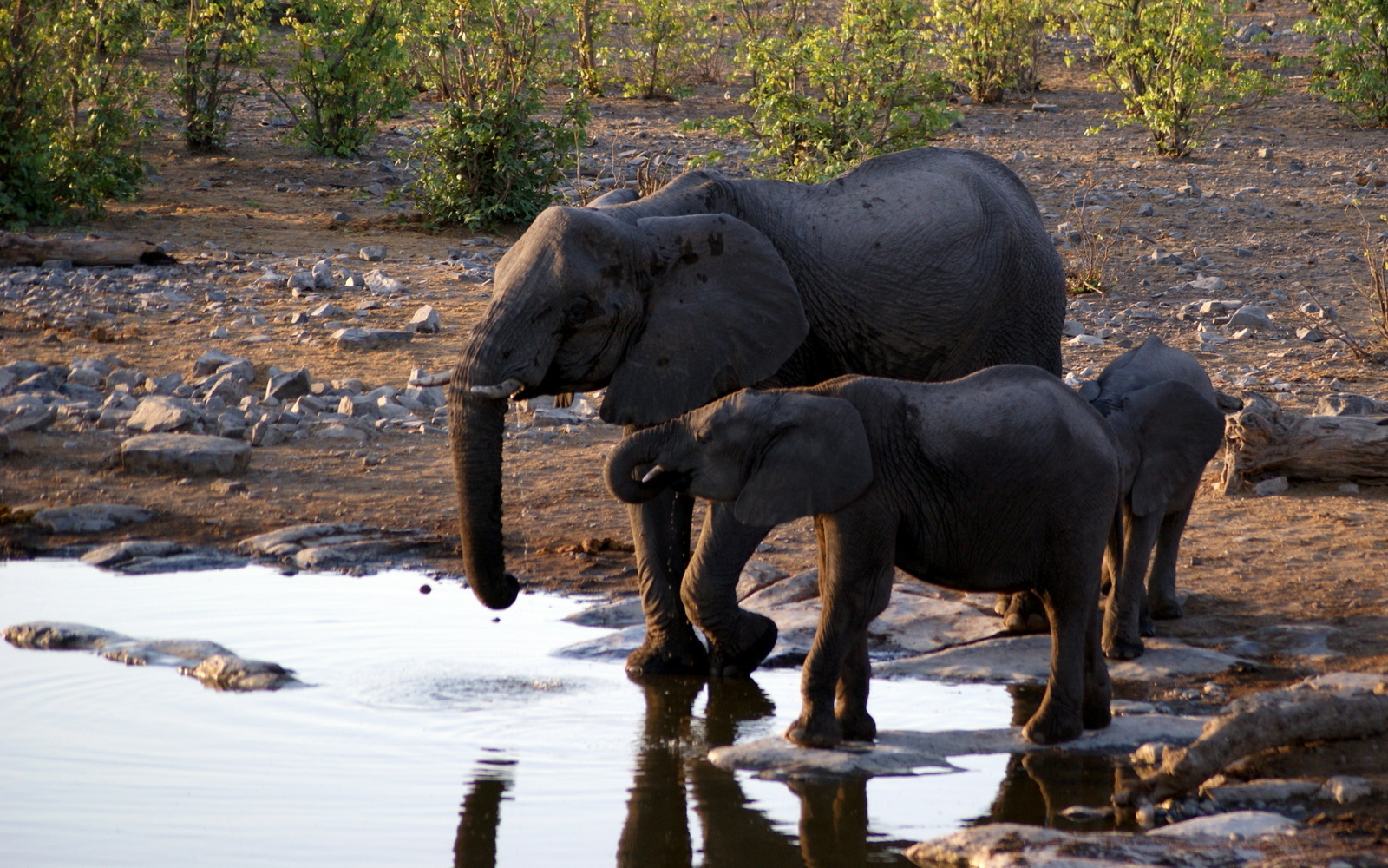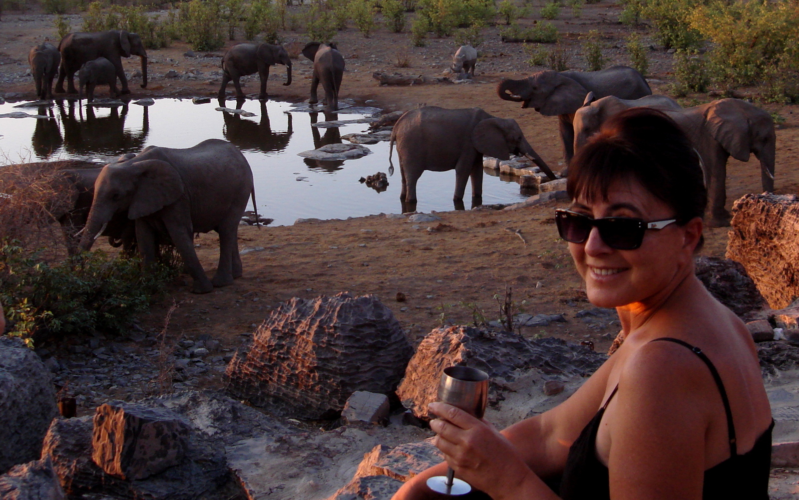 Leur point d’eau est le plus beau de tous les camps de la réserve. On s’installe au coucher du soleil avec une bonne bouteille sur une des nombreuses roches plates aux alentours et on admire le spectacle permanent de tous les animaux qui viennent s’ébattre et s’abreuver… Des éléphants par dizaines, un rhinocéros, 2 lions, une multitude d’herbivores, même un lièvre…