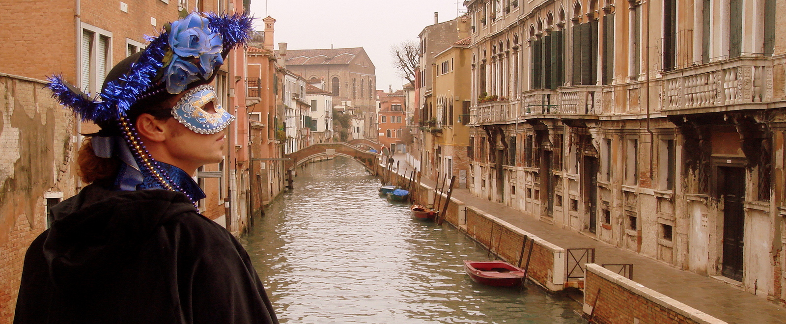 C’est vrai que le quartier est calme. L’hôtel est au bord d’un canal et on est plutôt agréablement surpris par sa qualité pour un hébergement de dernière minute. Il est décoré dans un style mauresque ponctué de masques (carnaval oblige !). La chambre est heureusement assez grande pour tous nos bagages et la literie est confortable. C’est plutôt un bon choix pendant cette période où tous les hôtels sont complets et leurs prix gonflés à l’hélium…