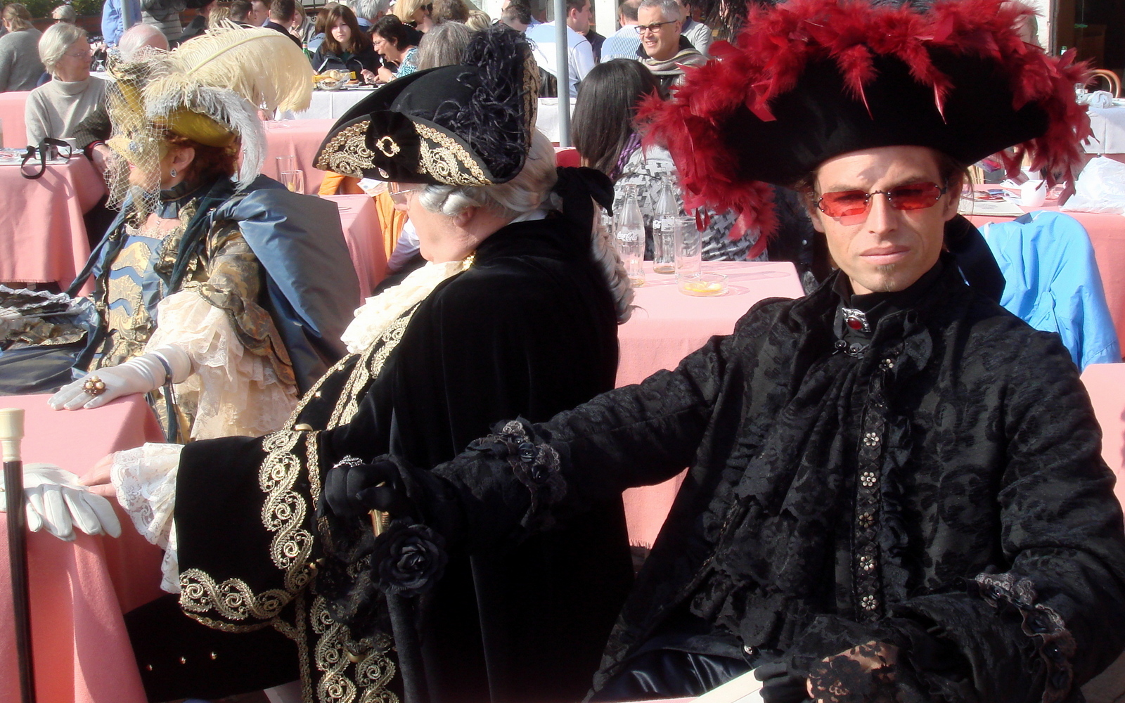Cette fois, nous avons un carnet d’invitations bien rempli: l’incontournable rendez-vous quotidien au CAFFE FLORIAN, les chocolats chauds chez les uns et les autres, les bals… On en avait déjà reçu par mail avant de partir et tous les jours, on nous invite à des événements costumés auxquels nous ne pouvons pas toujours participer faute de costume adéquat comme pour un brunch en tenue de lever (grande chemise, charlotte…) que nous n’avons pas… On prend quand même le temps, pendant nos déplacements, de faire quelques photos de tous ces costumes vénitiens si féeriques…