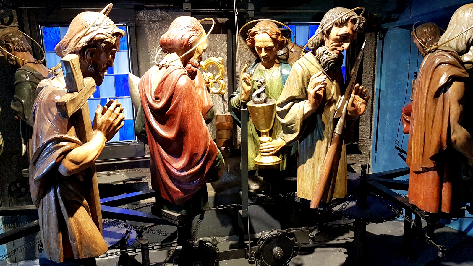 Si autant de monde s’attroupe devant régulièrement c’est parce que toutes les heures de 9h00 à 21h00, on peut voir les 12 apôtres défiler durant quelques secondes juste après que la figure de la mort sur la droite du cadran ne les appelle avec sa cloche et juste avant que l’heure ronde ne sonne. Le spectacle de ces statues qui apparaissent quelques secondes (23 en tout!) par les fenêtres au dessus du cadran est acclamé, filmé, commenté tel un événement tous les jours !!! Notez le trompettiste qui finit le spectacle tout en haut de la tour … Voici une vidéo YouTube pour vous en donner un aperçu …