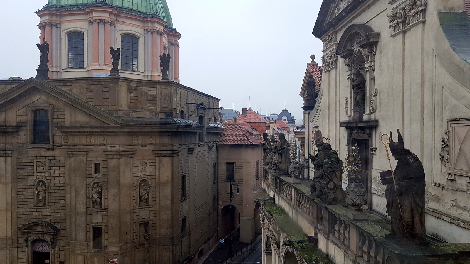 Si vous arrivez à ouvrir la fenêtre sans vous faire hurler dessus par la « gardienne », vous pourrez profiter d’une superbe vue sur la tour du pont Charles et le balcon de l’Eglise Saint-Sauveur de Prague juste en face…