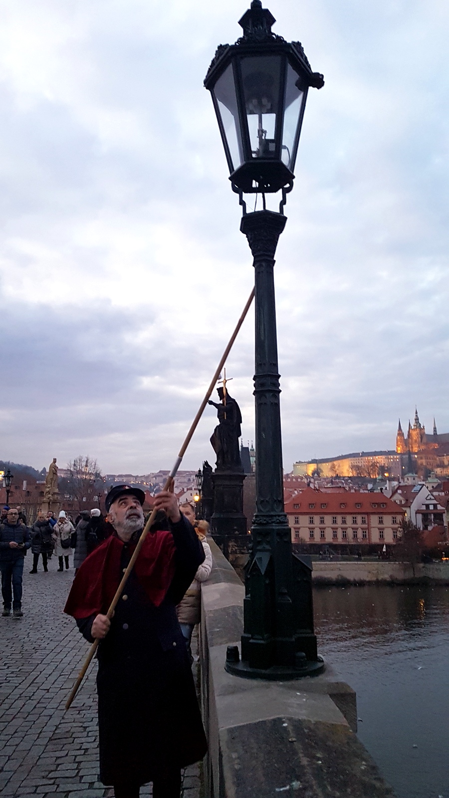 Dans son costume d’époque du XIXème siècle, à l’aide d’un long bâton, il commence à allumer les lampes du pont côté Vieille Ville à droite pour faire demi-tour côté Male Strana et revenir en sens inverse. Cet allumage peut durer une bonne heure car le préposé en profite pour discuter volontiers avec les artistes de rue ou les touristes curieux qui le suivent dans ce spectacle d’un autre temps !!!…