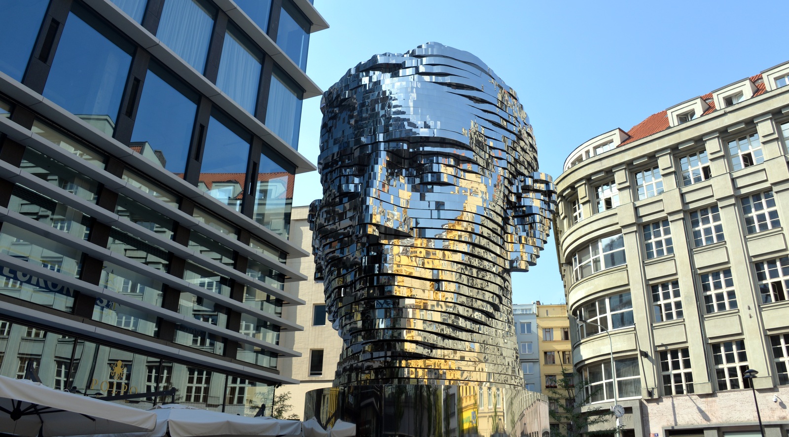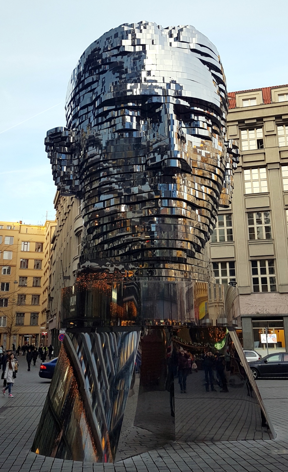 Sûrement, l’œuvre de David Cerny la plus appréciée et la plus photographiée !!! Il faut bien avouer qu’elle est belle cette création en perpétuel mouvement qui représente la tête de Frantz Kafka.