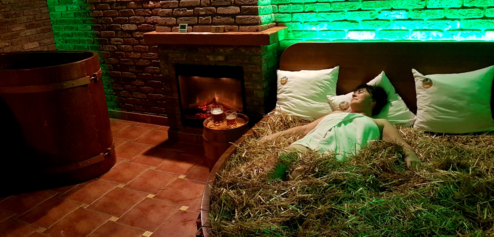 On ne se baigne pas réellement dans la bière mais dans un bain où sont mélangés tous les ingrédients qui composent la bière: le houblon, le malt et la levure de bière dont le mélange est préparé devant nous. Il y a une salle de bains attenante pour pouvoir prendre une douche si on le désire.