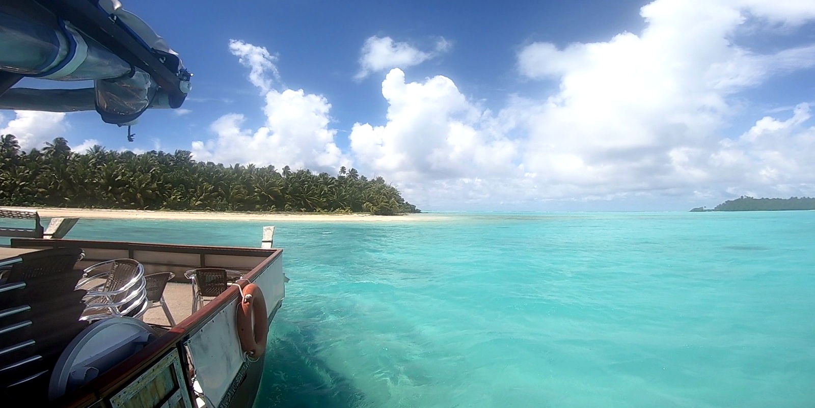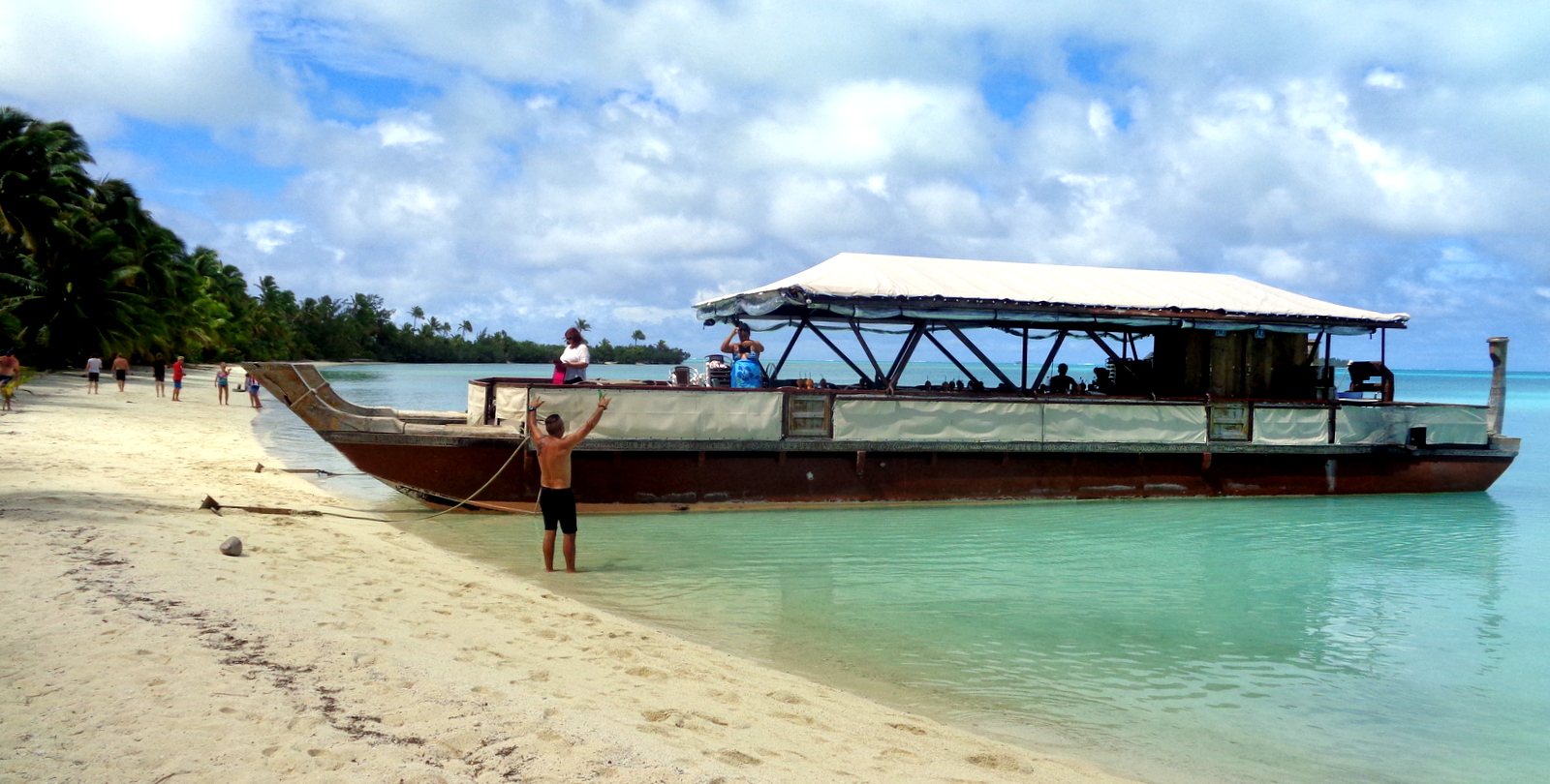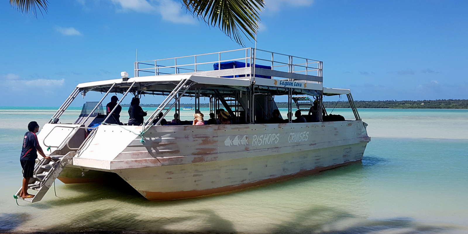 – le bateau part de la plage OOTU après l’AITUTAKI VILLAGE, c’était donc très pratique pour nous (on peut aussi être transporté depuis le centre ville…). Pour info, le départ du Bishop Cruises se fait devant l’AITUTAKI VILLAGE et aucune idée pour le TE KING car les participants étaient ramassés sur la presqu’île et emmenés ailleurs…
