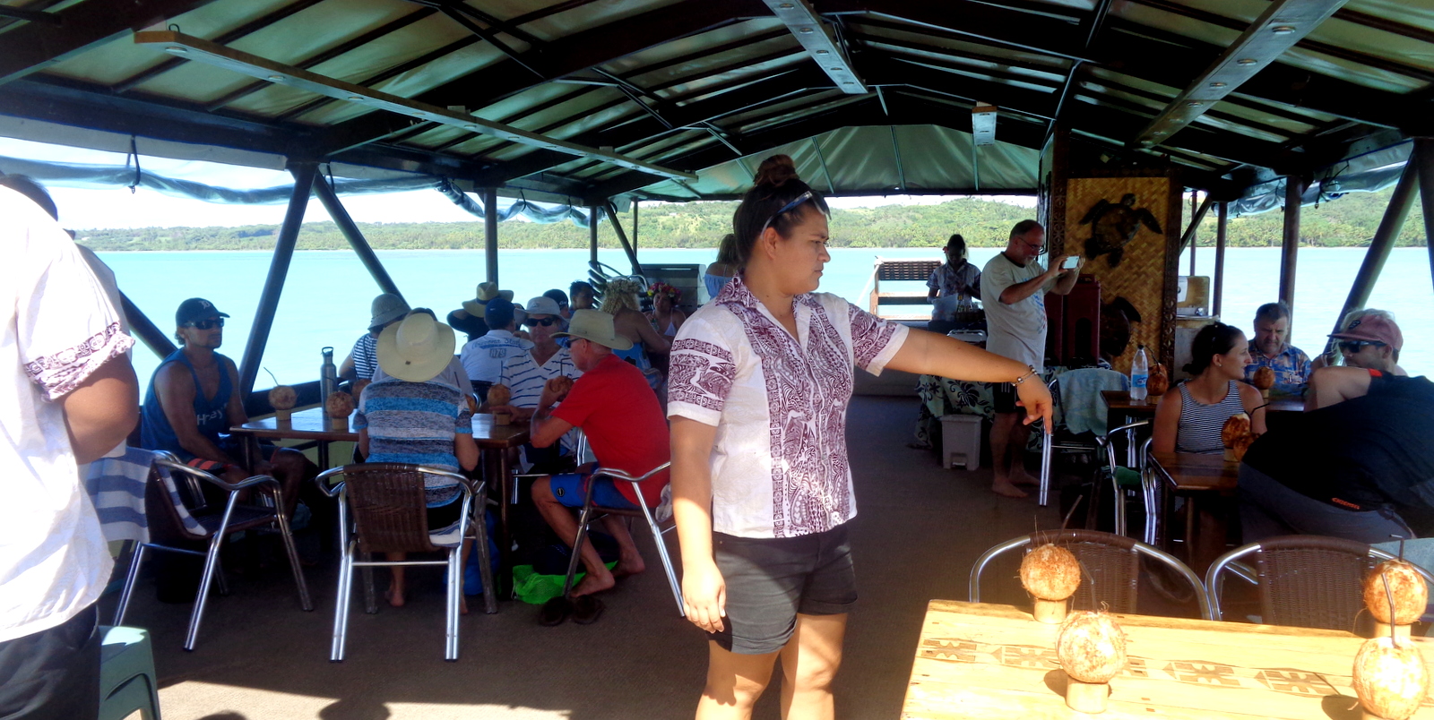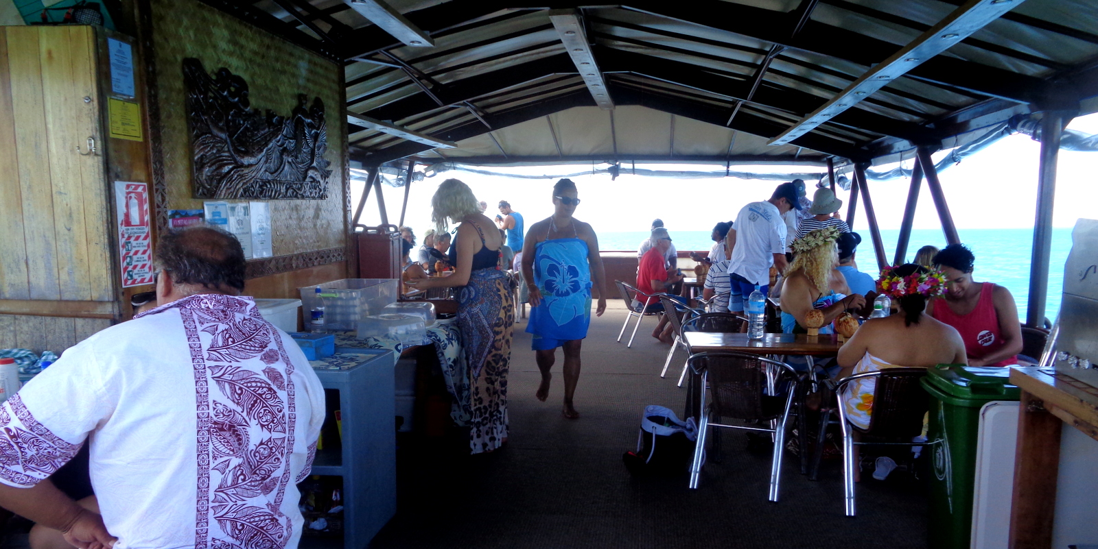 En fait, le bateau est une grande barge à fond plat décorée à la polynésienne sur laquelle sont installées des tables et des chaises, un peu comme une grande salle de restaurant flottante…Nous étions une trentaine sur le bateau et il y avait largement de la place pour tout le monde. On choisit de s’installer où on veut sur une des tables de 6 personnes…