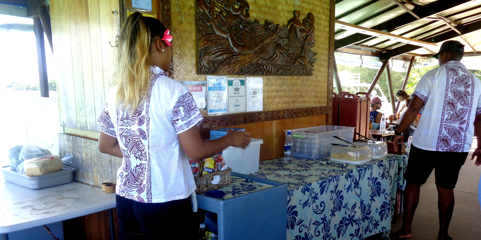 C’est ici, au milieu de nulle part qu’on nous sert un magnifique buffet de produits locaux: embryon de noix de coco, fruits de la passion, poisson grillé, uru, patates douces… Ce « restaurant » sur l’eau avec une vue à 360°C sur le bleu du lagon est unique !!!