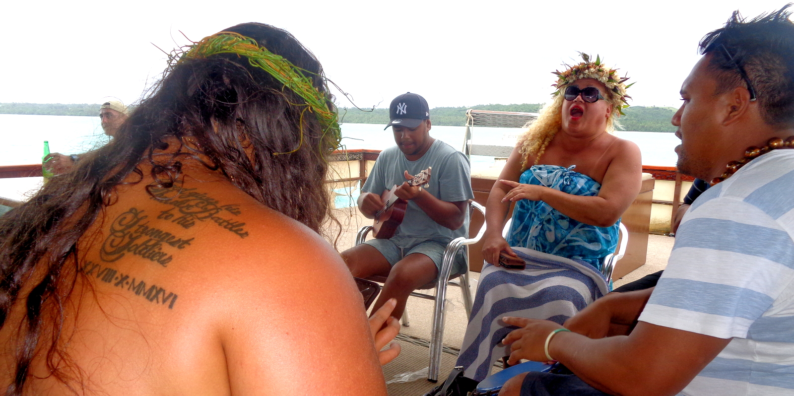 En plus des quelques clients de l’Aitutaki Day Tour, il y a quelques locaux dont une célèbre chanteuse: TANGEE qui est en vacances dans sa famille à Aitutaki. Très vite, un concert de chant et d’ukulélés s’improvise sous les regards admiratifs dus à la renommée de Tangee…