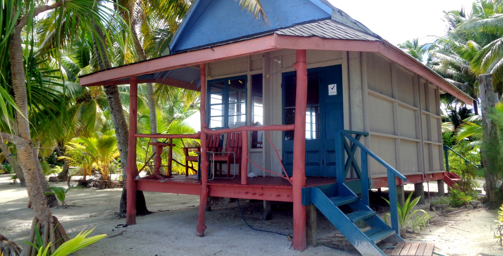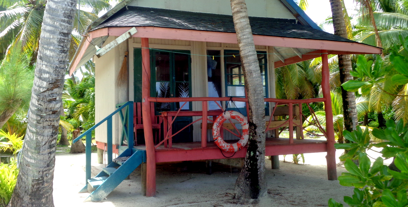 On s’arrête pour prendre 2 passagers à l’AITUTAKI LAGOON RESORT ce qui nous donne l’occasion de constater l’état de délabrement des toits de palmes des bungalows sur pilotis (au tarif où ils sont vendus: 1200 NZ$ soit 720€, c’est un peu abusé!).