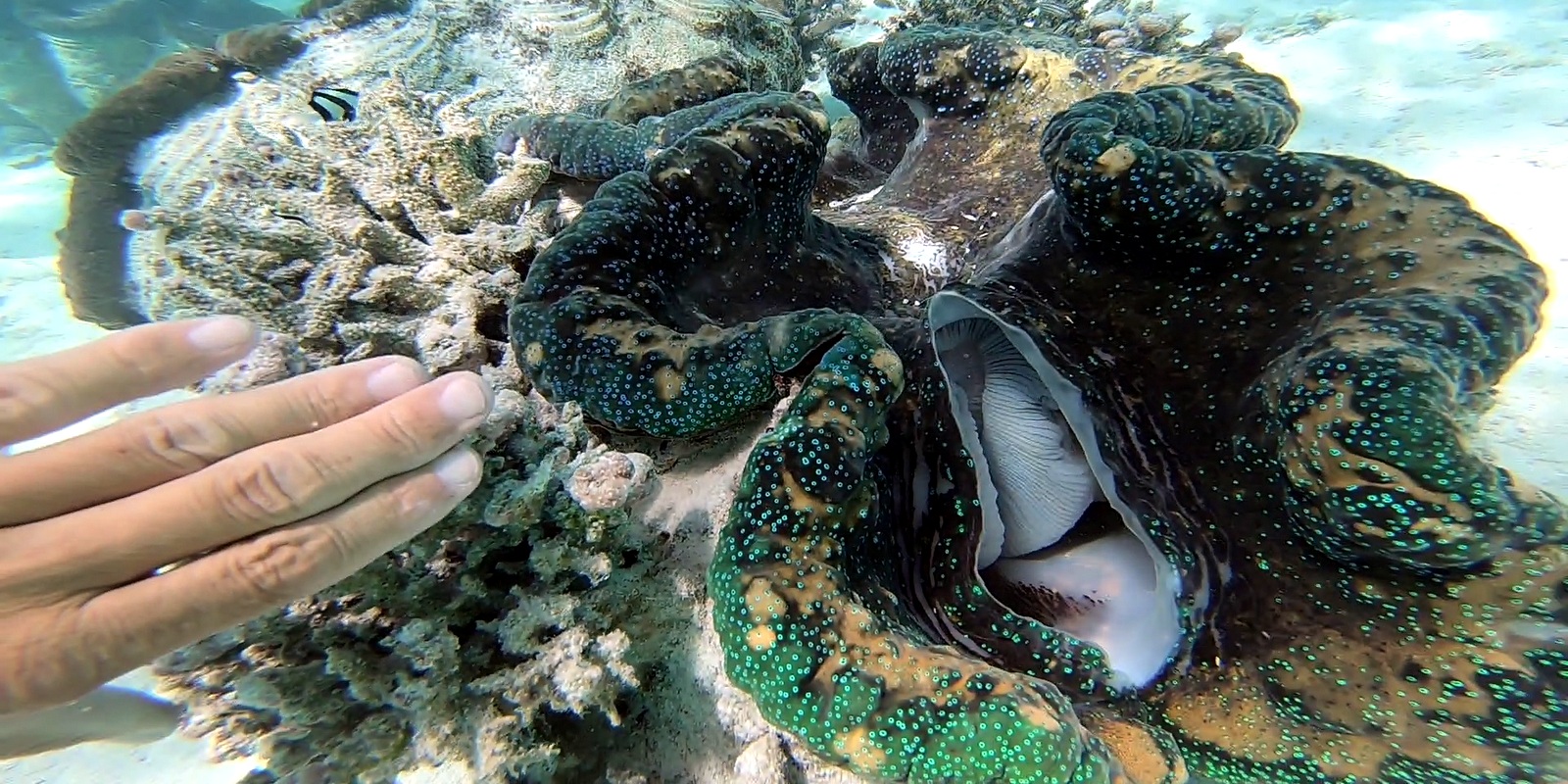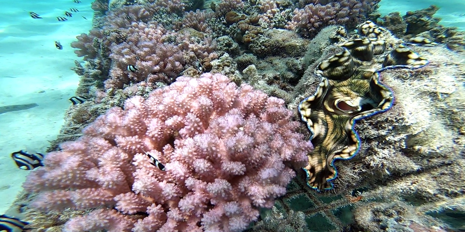 Bizarrement, l’eau parait claire et en fait, elle est trouble et il y a donc peu de visibilité pour le snorkeling. De toutes façons, il n’y a pas beaucoup de poissons, juste beaucoup de limaces de mer de toutes sortes et quelques grosses étoiles de mer bleues. Aucun requin non plus dans le lagon contrairement à la Polynésie…On a essayé de savoir pourquoi et les réponses ont été très confuses: ils ont tous été pêchés et mangés (?), l’eau est trop trouble (?). Celle qui semble la plus probable est que leur absence est due à la surpêche qui a vidé le lagon de ses poissons (plus de nourriture= plus de prédateurs) mais ça même les locaux ont du mal à le reconnaître….