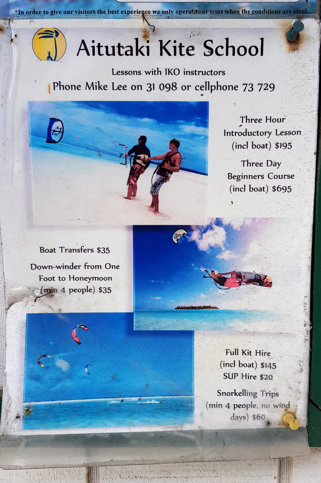 Aitutaki est réputée pour être une des meilleures destinations de Kitesurf dans le monde et c’est vrai que ce grand lagon peu profond avec ses bancs de sable est idéal.