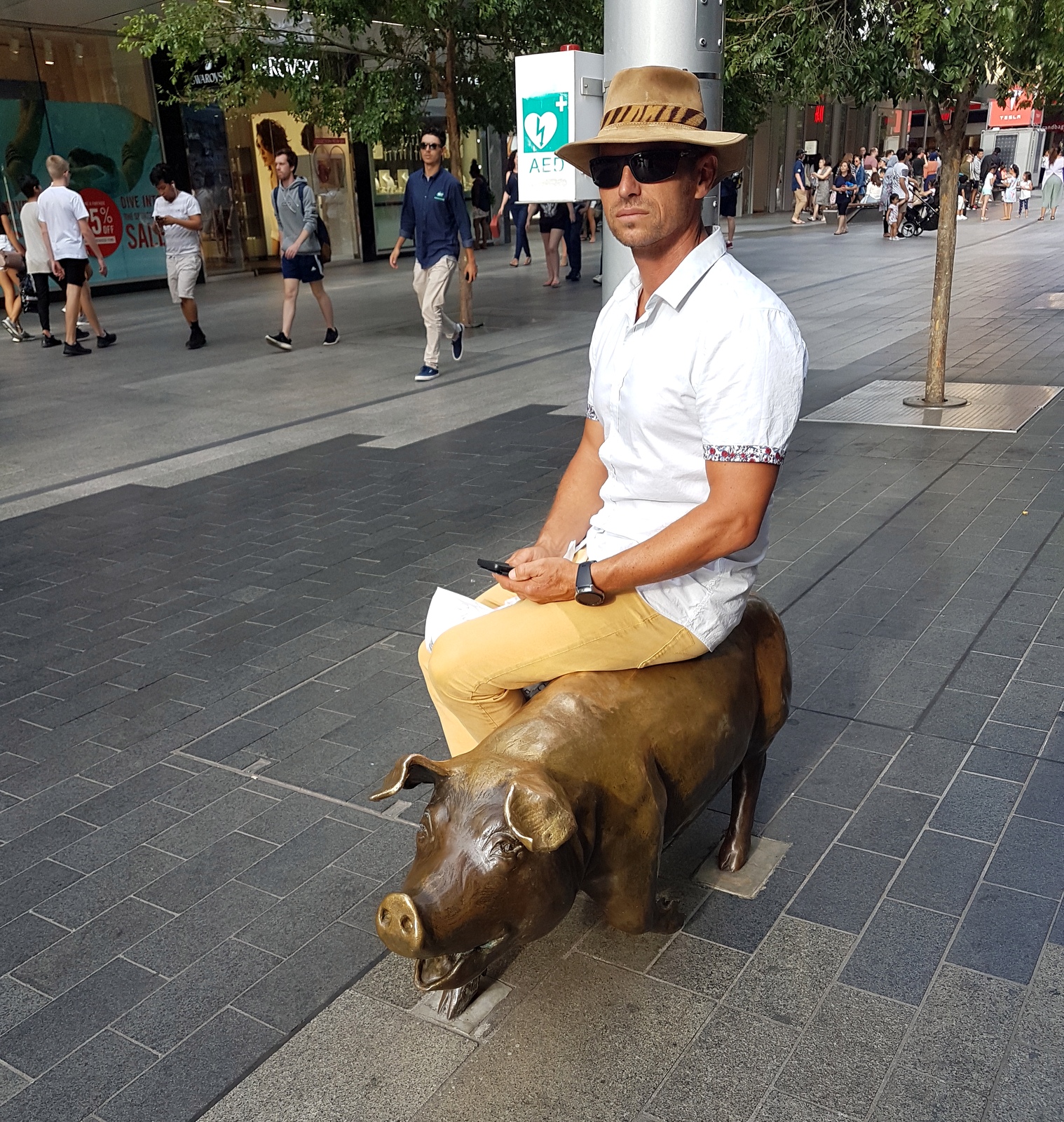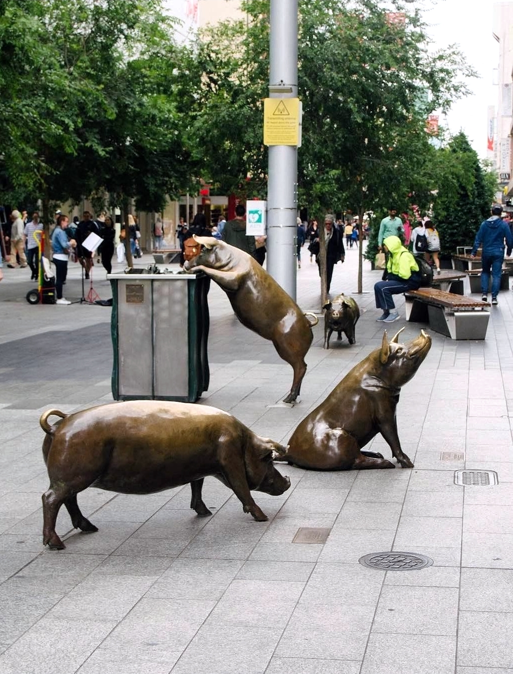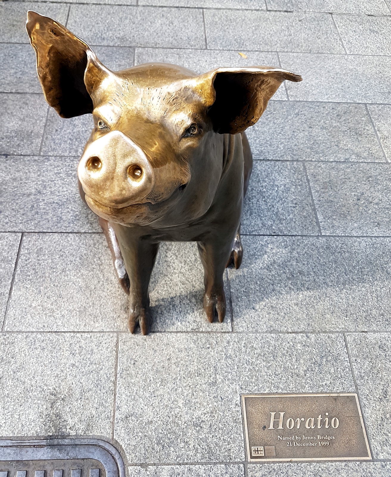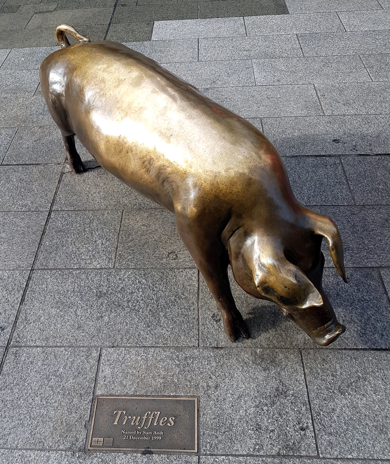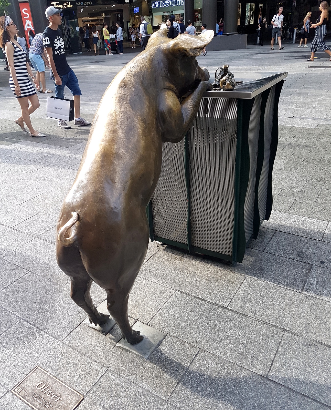 En plein milieu, les 4 sculptures de bronze représentant des cochons sont de véritables célébrités à Adelaïde. Elles portent toutes un nom: Horatio, Oliver, Truffles et Augusta et sont mises en scène dans différentes positions. Elles ont été installées en juillet 1999, à la suite d’un concours de sculptures remporté par leur créatrice, Marguerite Derricourt, qui n’est pas française comme son nom pourrait le faire croire, mais sud-africaine! Elle se serait inspirée d’une fontaine à Florence pour les réaliser mais il se dit que leur signification pourrait s’apparenter aux clients qui « reniflent » les bonnes affaires…