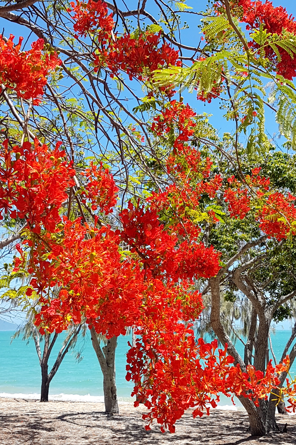 C’est une grande plage peu fréquentée, il faut le reconnaître, où le turquoise de la mer créait un contraste saisissant avec le rouge des fleurs des flamboyants…