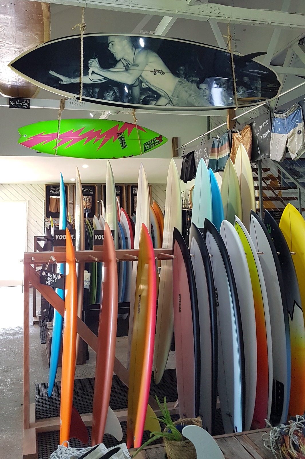 Inévitable pour tout amateur de surf, pratiquant ou non… Des planches de toutes sortes, vintage et collector (chères), occasion à petits prix, faites sur mesure… On peut aussi faire réparer son matériel, acheter des vêtements, des accessoires. Le personnel est très sympathique et c’est devant cette énorme boutique qu’on trouve le signe Byron Bay en planches de surf (photo en tête de cet article).