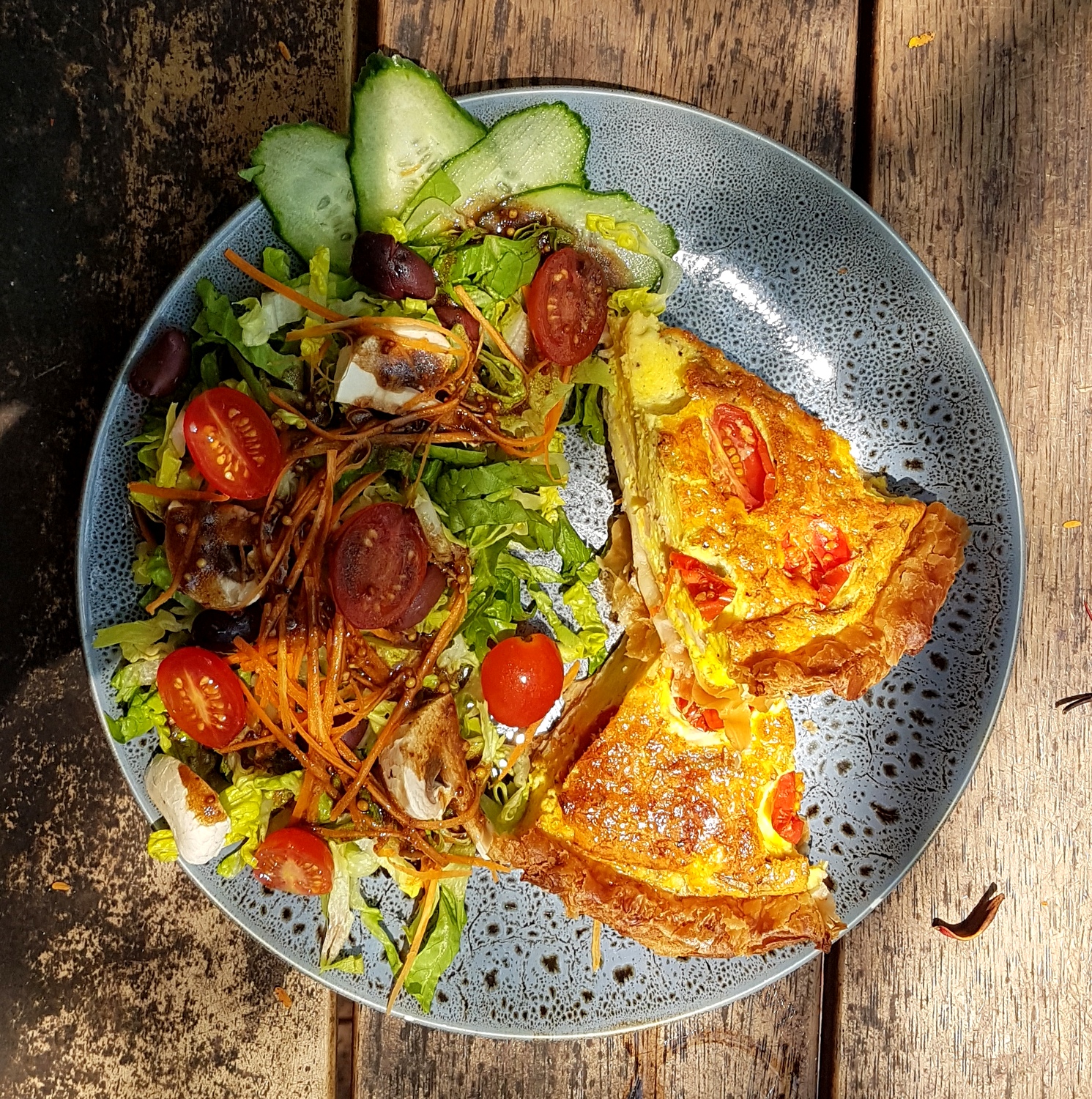 Ils ont fait des pizzas au feu de bois leur spécialité mais il faisait si chaud qu’on a préféré manger léger avec leur excellent plat du jour: une quiche aux légumes avec de la salade !!!