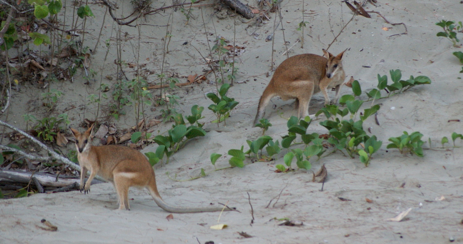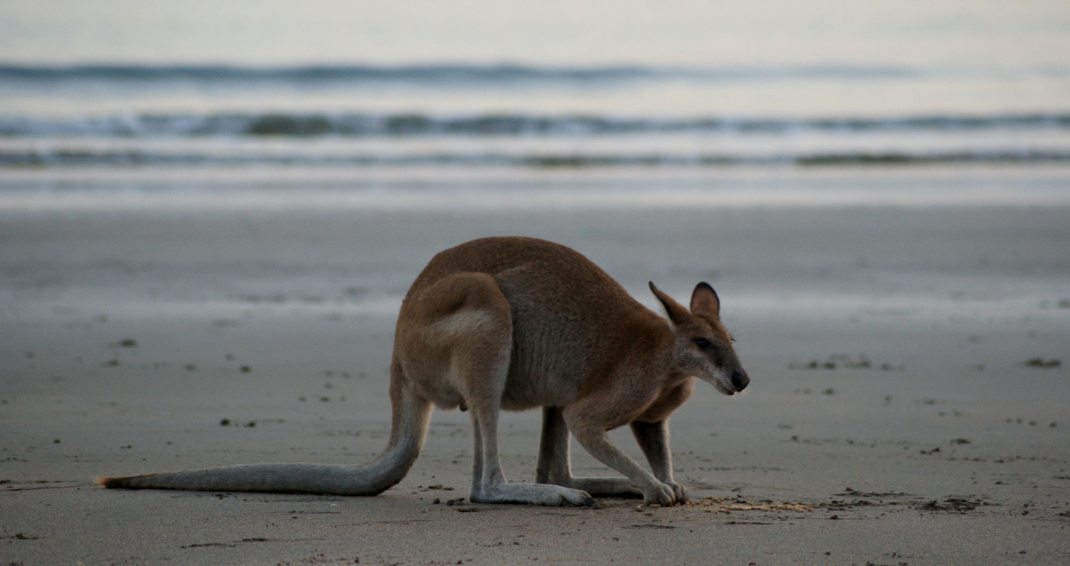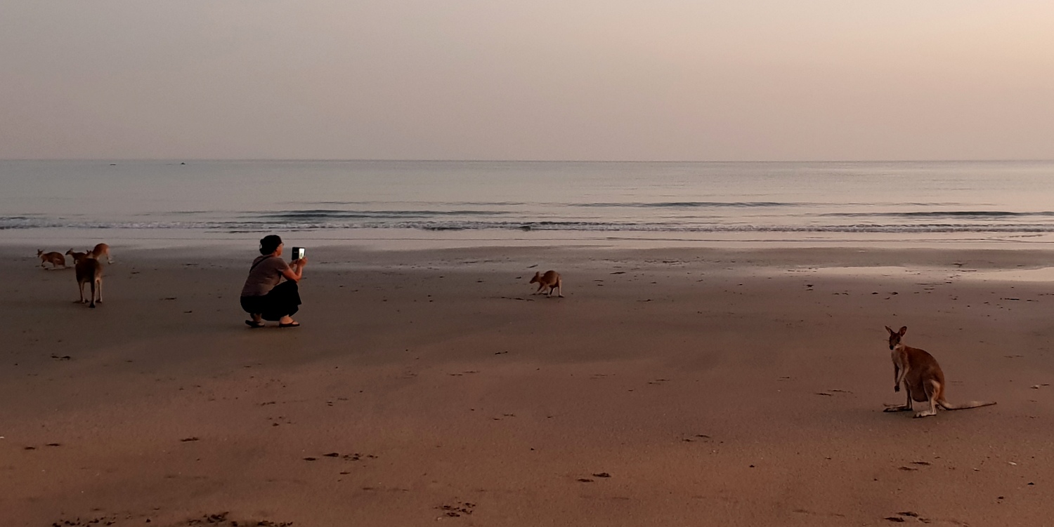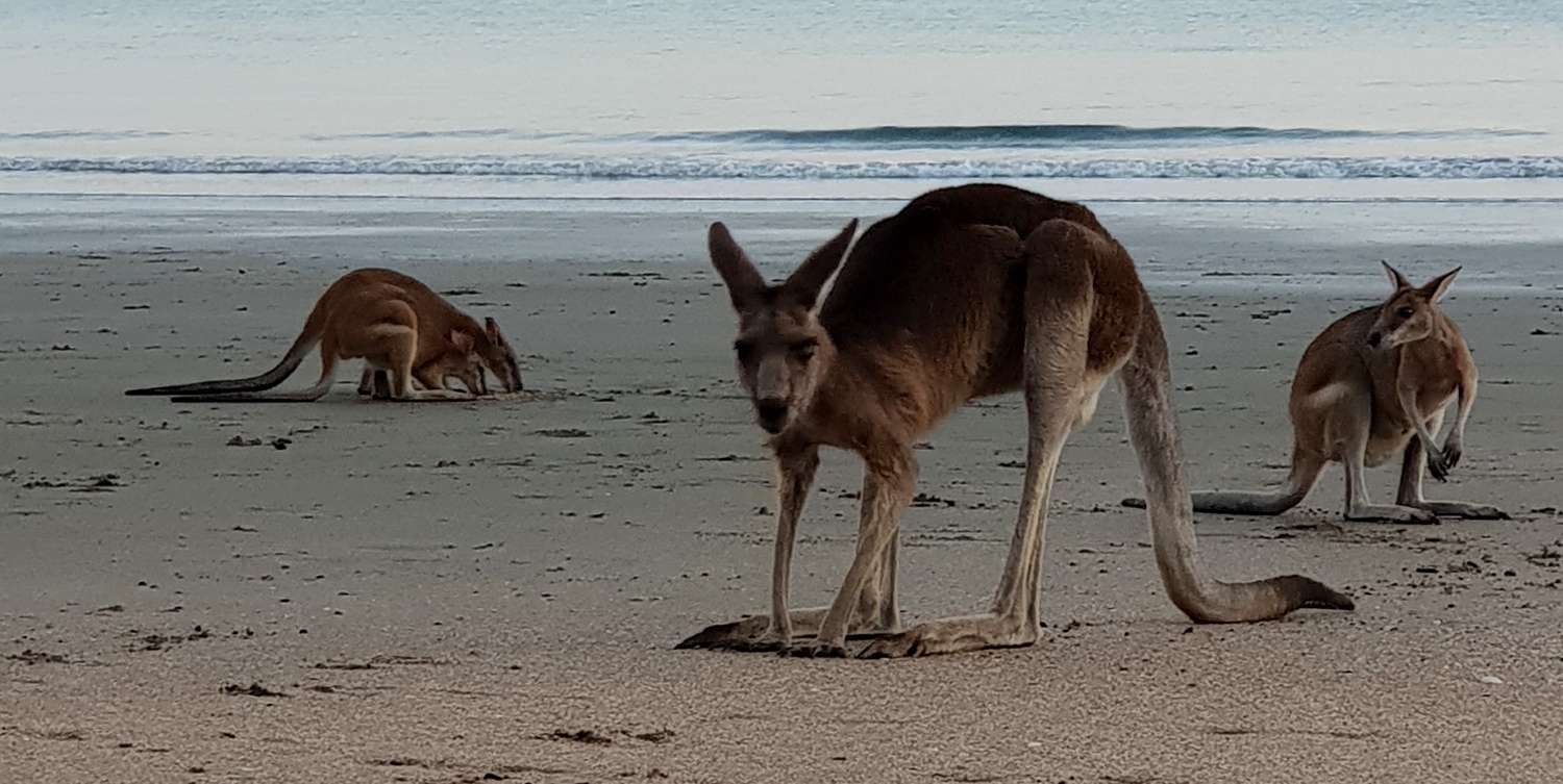 Les kangourous arrivent sur la plage juste avant que le soleil ne commence à apparaître pour manger les graines de mangroves que la marée a rapportées, enfin ça c’est que qu’on raconte dans les guides, en vrai ils viennent manger les graines que leur dispose un ranger au milieu d’un périmètre de sécurité délimité par des cônes de chantier !!!