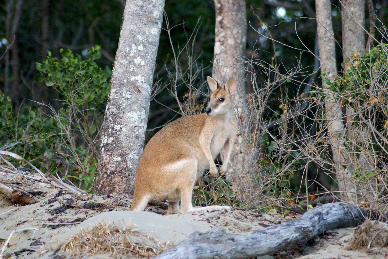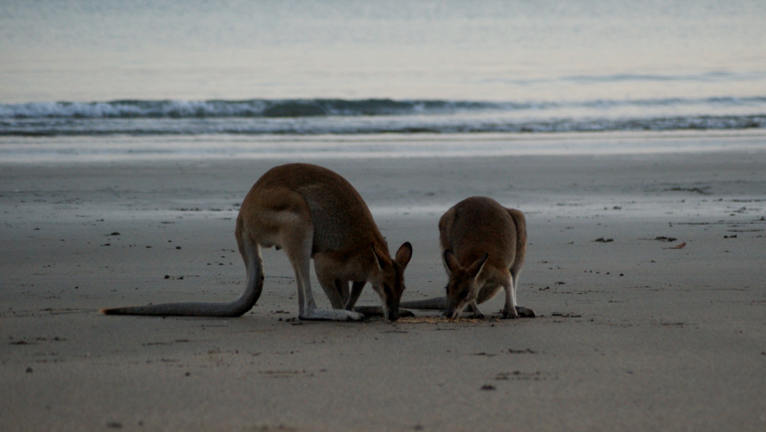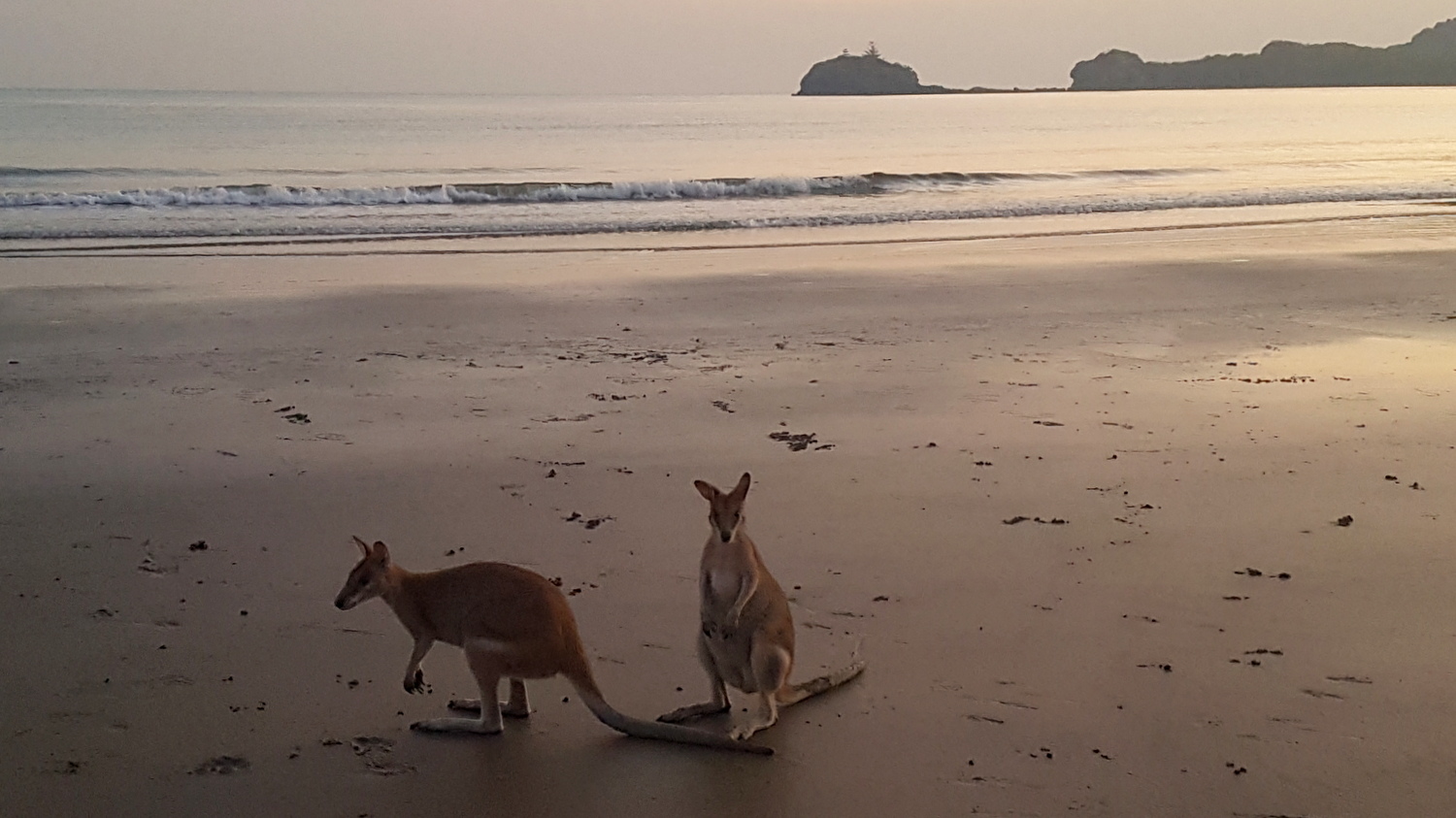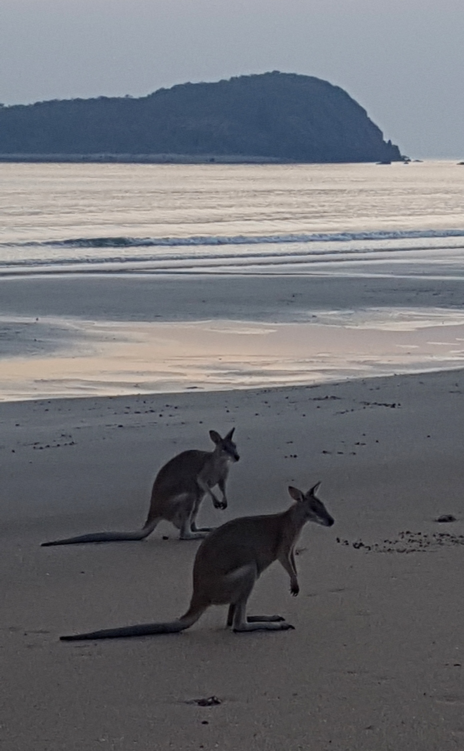 Les kangourous arrivent sur la plage juste avant que le soleil ne commence à apparaître pour manger les graines de mangroves que la marée a rapportées, enfin ça c’est que qu’on raconte dans les guides, en vrai ils viennent manger les graines que leur dispose un ranger au milieu d’un périmètre de sécurité délimité par des cônes de chantier !!!