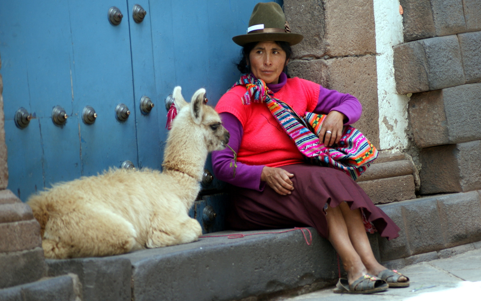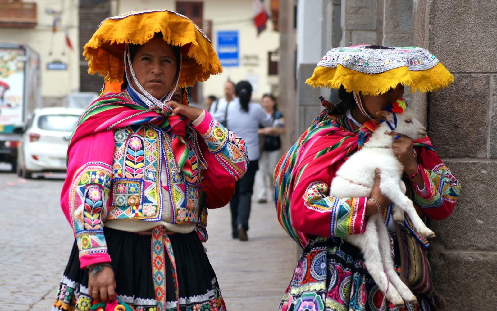 CUZCO étant très touristique, on croise de nombreuses femmes en habits traditionnels avec des lamas ou des agneaux qui nous sollicitent pour des photos. Même si j’ai été agréablement surprise de constater que les péruviens traitent mieux les animaux qu’il y a une vingtaine d’années (visiblement il y a une grande campagne dans ce sens, on voit de grands panneaux pour la protection animale à l’entrée des villages…), je n’ai pas voulu cautionner ce business… Les photos ci-dessous ont donc été « volées » grâce à mon écran LED orientable ( idéal pour les portraits ) mais attention, elles sont vigilantes…