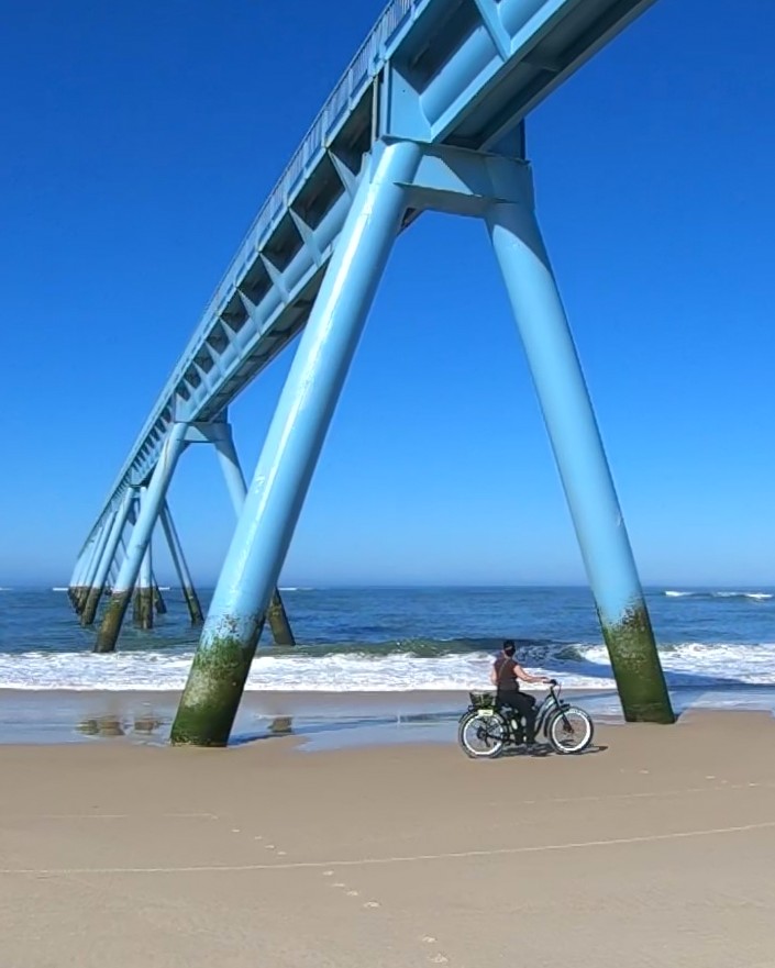 On les a loués « AU VELO POUR TOUS » à Biscarrosse-Plage après les avoir réservés quelques jours auparavant. Après de bonnes explications sur le fonctionnement de l’assistance électrique et comment la coupler avec les vitesses, on s’est dirigé vers la plage du Vivier pour rejoindre la plage…