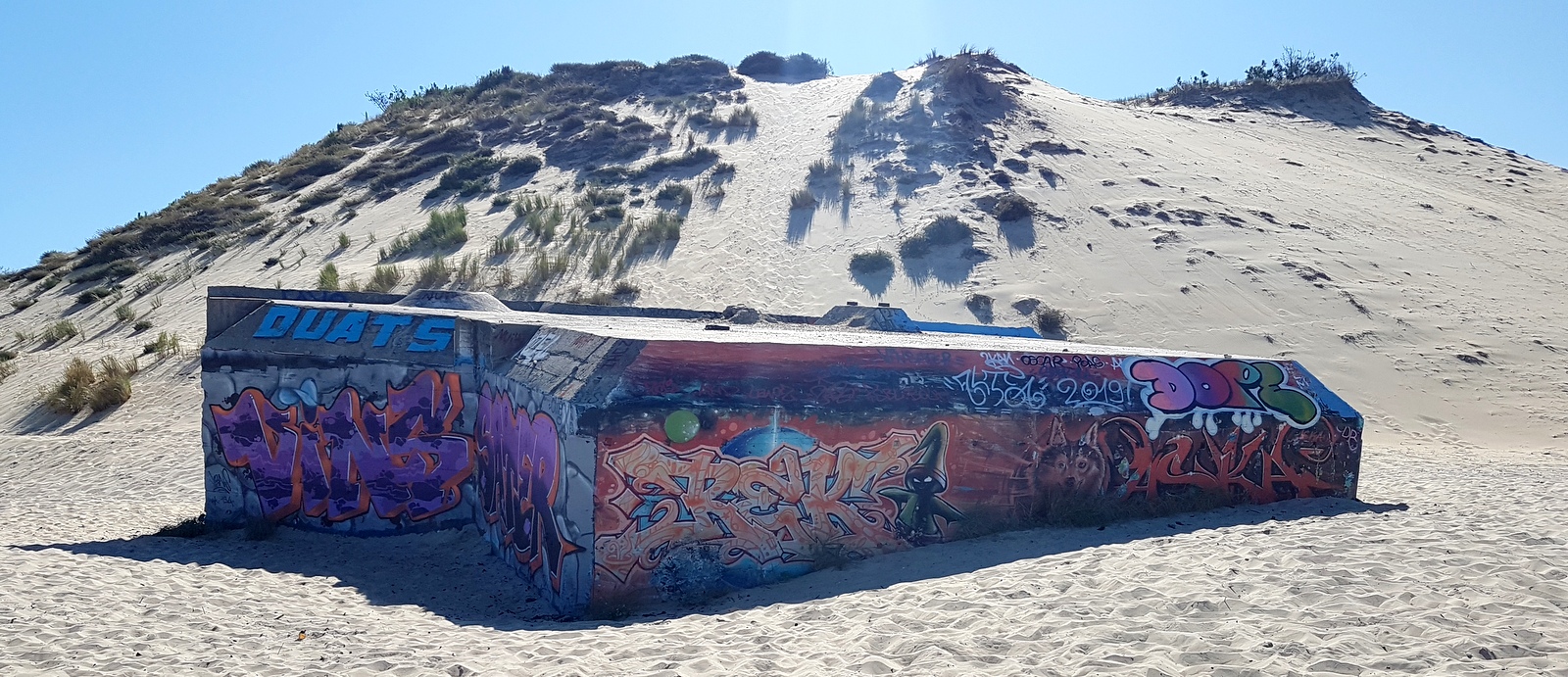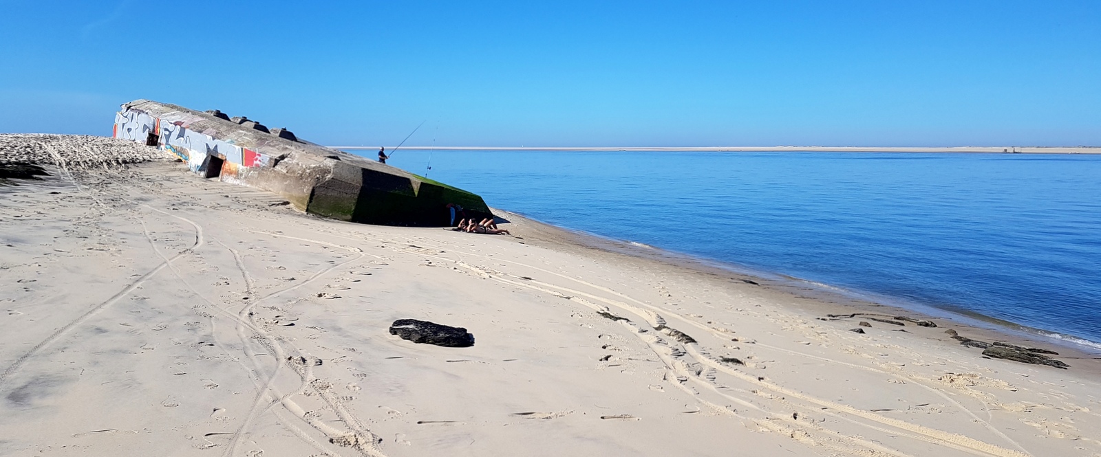 C’est après les blockhaus, magnifiquement tagués, au pied du début de la dune du Pilat, que ça se corse. L’amplitude des marées étant plus faible sur le bassin, la portion de sable mouillé est beaucoup plus réduite et il y a de nombreux pêcheurs avec leurs lignes qu’ils faut contourner dans le sable sec… donc à pied, en tirant-poussant-portant les vélos… tout de suite beaucoup moins drôle !!! En essayant de prendre de l’élan pour passer la portion de sable sec, la roue avant se plante dans le sable et le vélo se renverse sur le côté sans que je puisse retenir ses 32 kgs !!!
