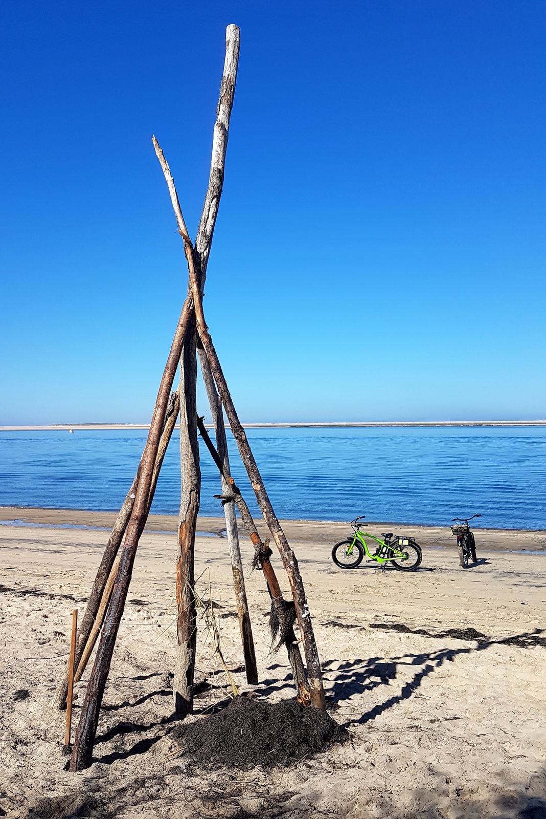 Première chute à l’arrêt dans la descente vers la plage parce que la roue avant a bloqué dans le sable mou et que le vélo pèse un « âne mort » (32 kgs), pas facile à retenir dès qu’on est déséquilibré!!! On comprend qu’il nous faudra pousser-tire-porter l’engin sur le sable sec donc rouler au maximum sur le sable dur…