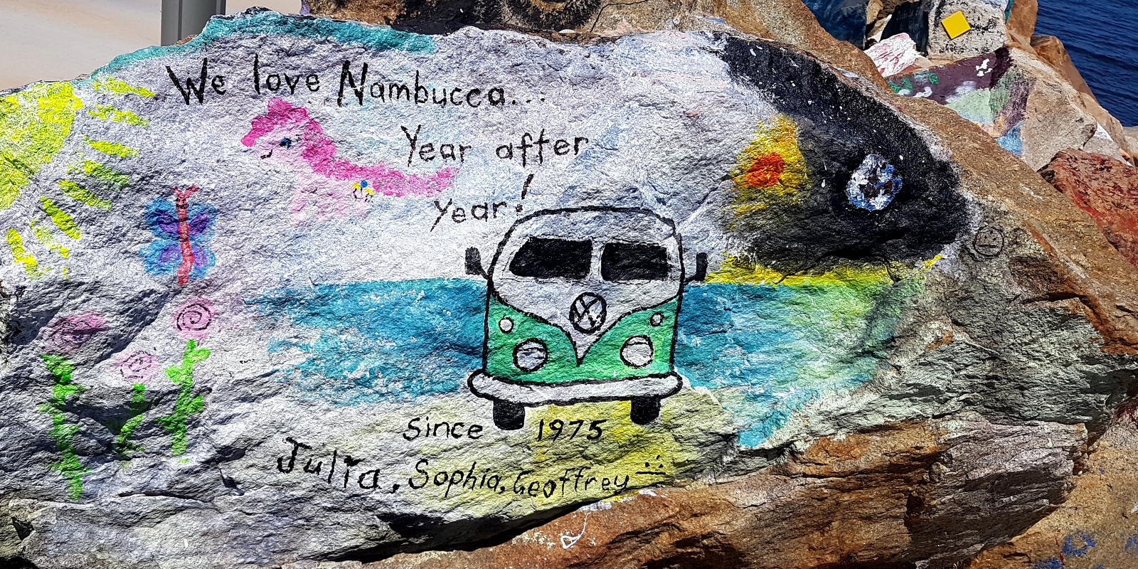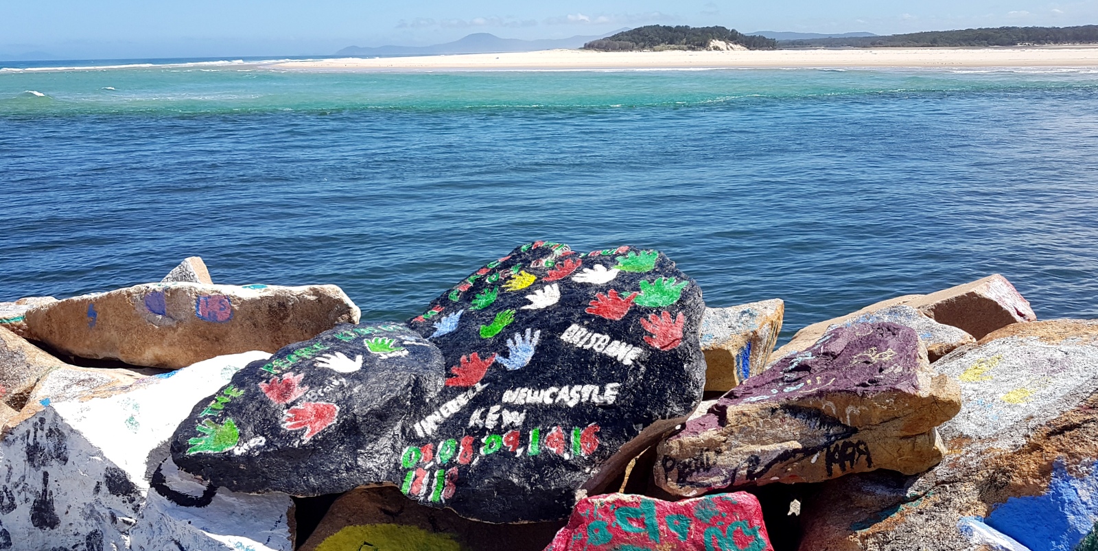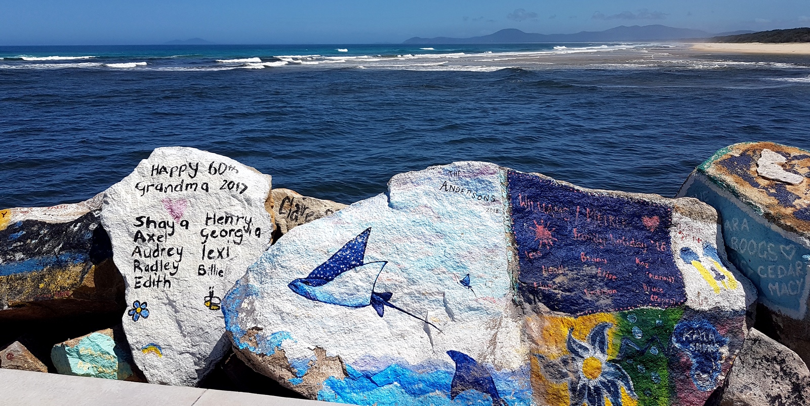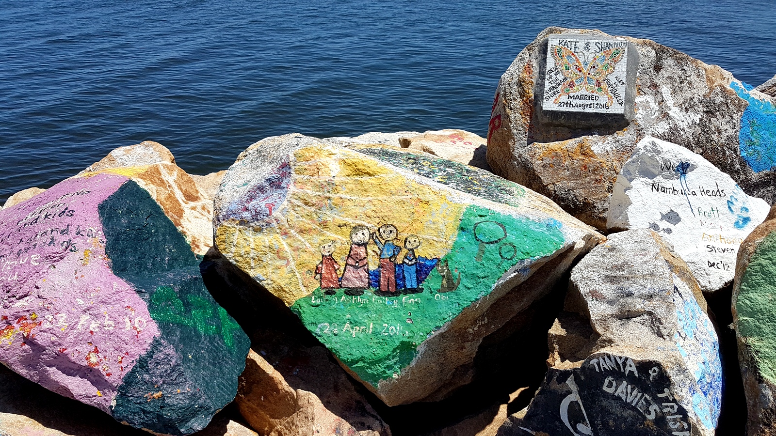 Ce sont des centaines de rochers peints qui longent la jetée de l’embouchure de la Nambucca River. Remerciement, hommage, souvenir de vacances ou juste un délire artistique… chacun est libre de s’exprimer et de laisser sa trace et son inspiration sur un de ces nombreux rochers. Ne vous gênez surtout pas pour laisser la votre, à condition d’apporter le matériel et de trouver un rocher disponible le long de ces 500m de jetée !!!