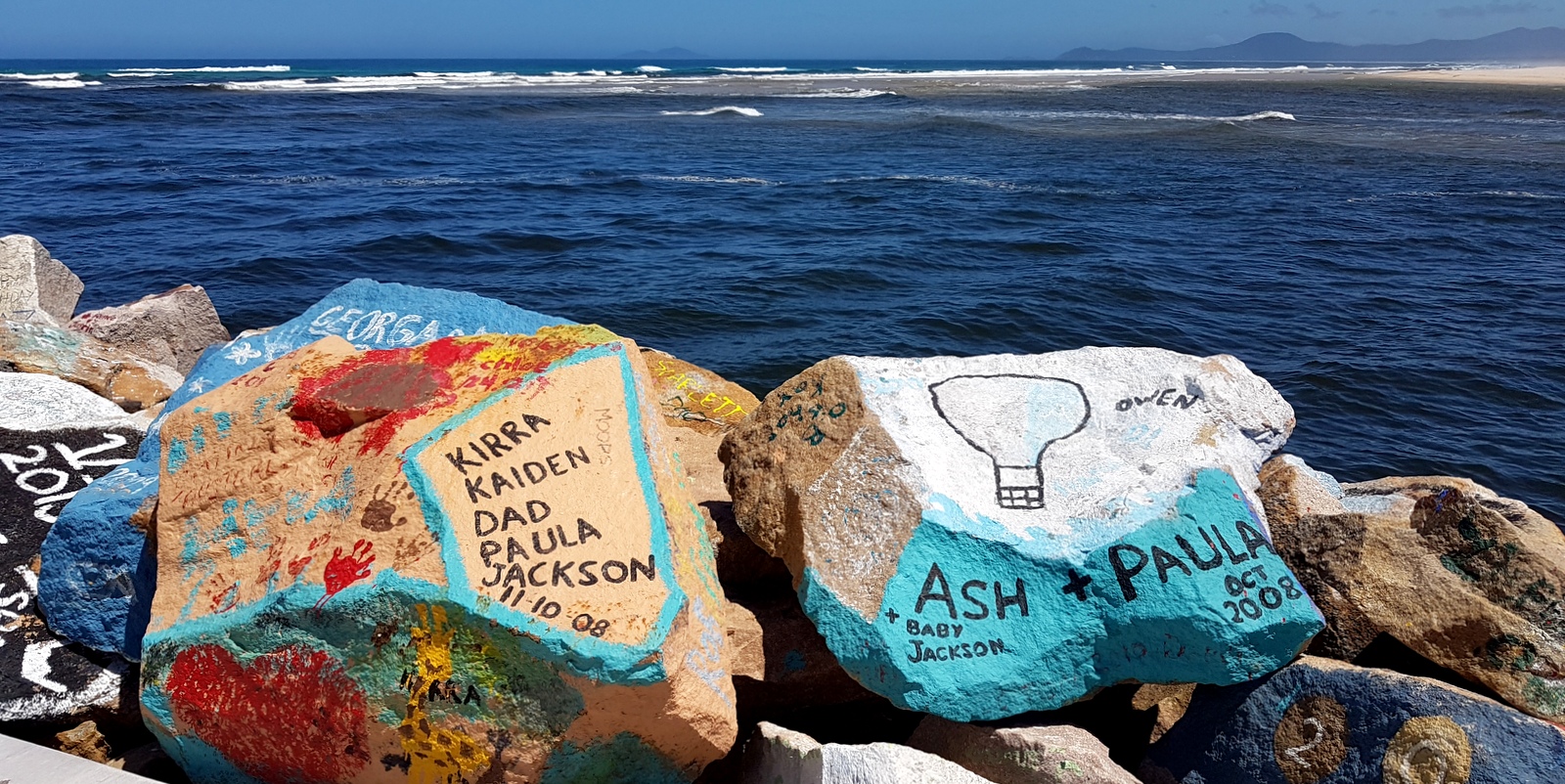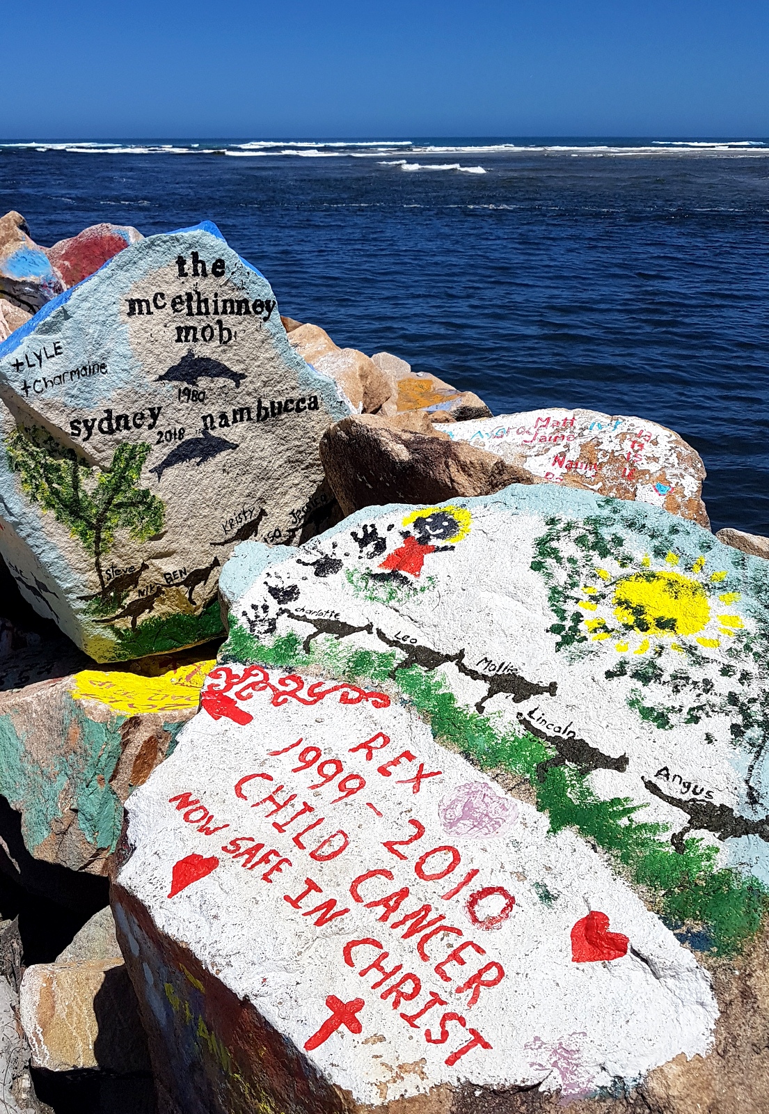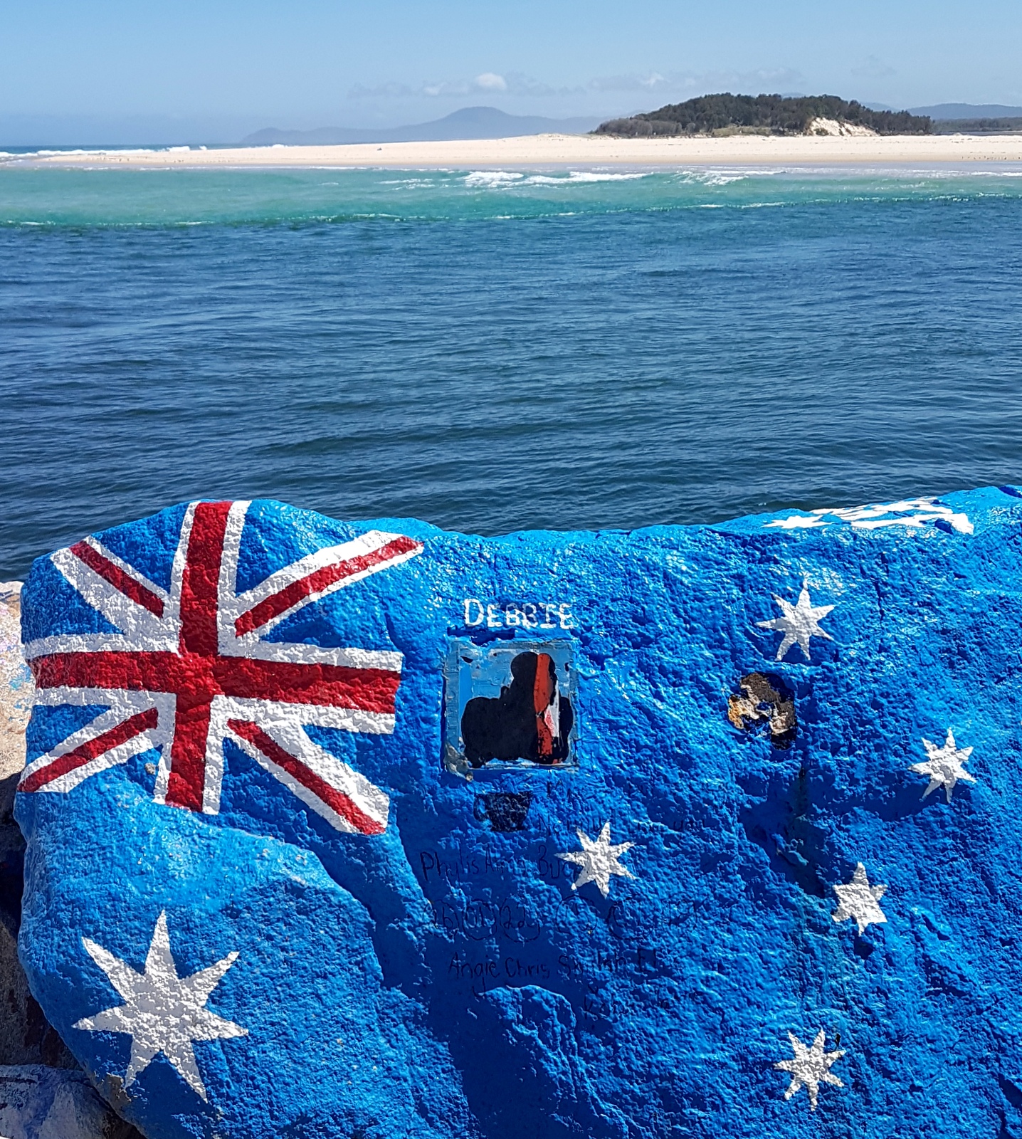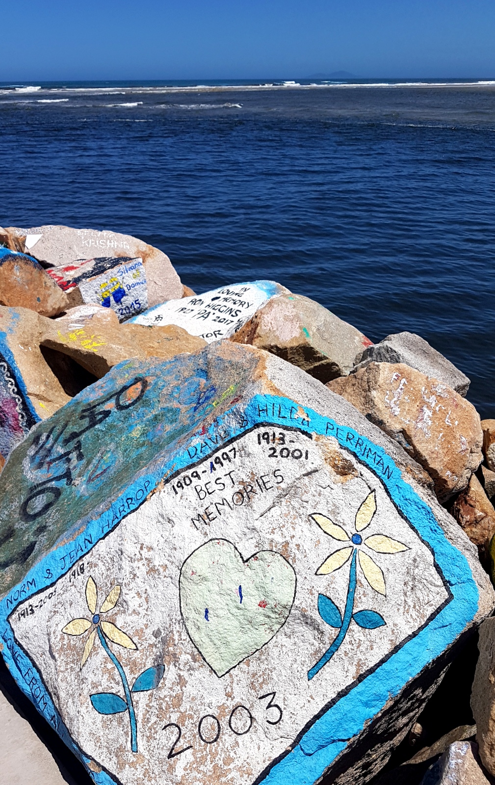 Ce sont des centaines de rochers peints qui longent la jetée de l’embouchure de la Nambucca River. Remerciement, hommage, souvenir de vacances ou juste un délire artistique… chacun est libre de s’exprimer et de laisser sa trace et son inspiration sur un de ces nombreux rochers. Ne vous gênez surtout pas pour laisser la votre, à condition d’apporter le matériel et de trouver un rocher disponible le long de ces 500m de jetée !!!