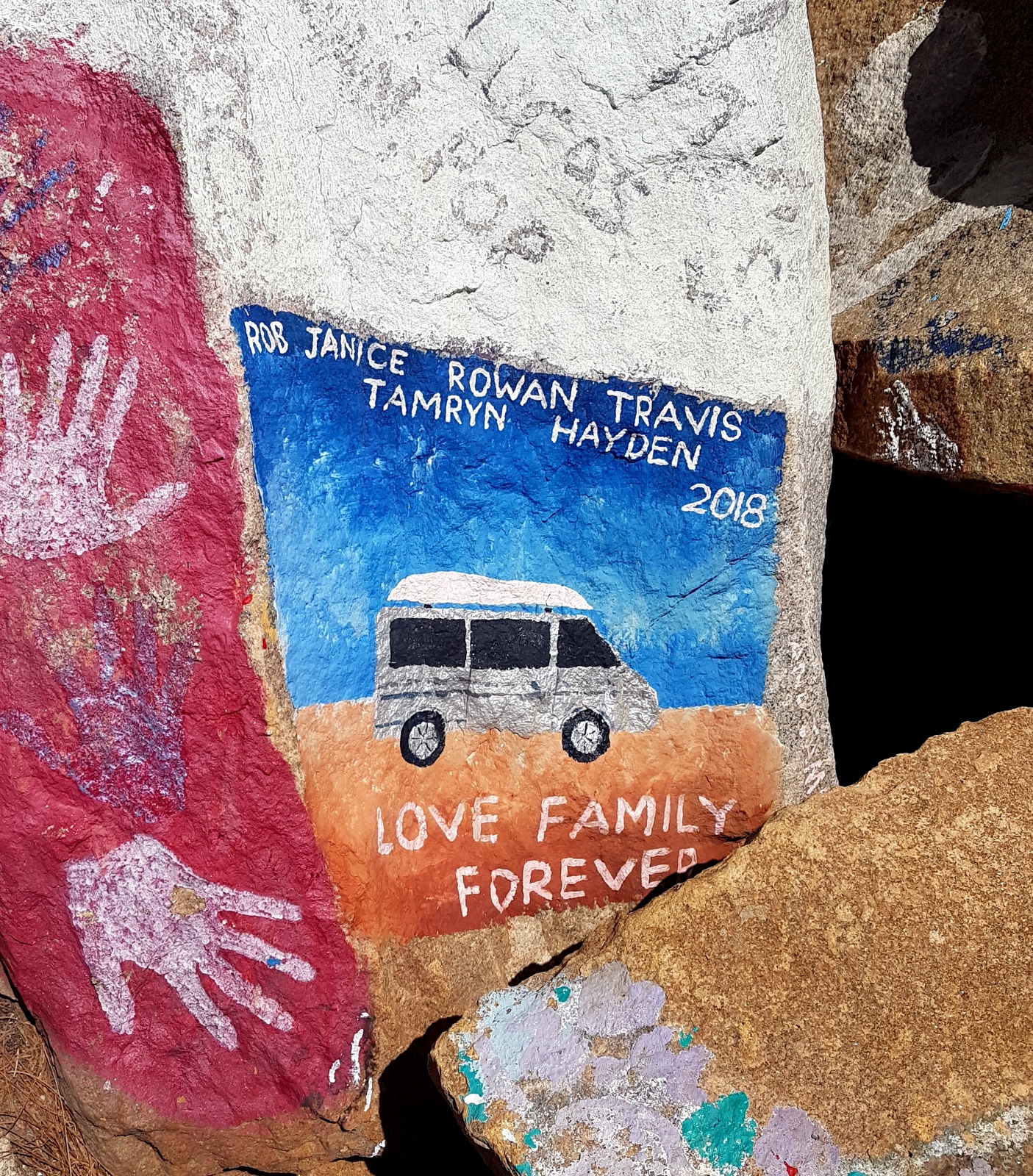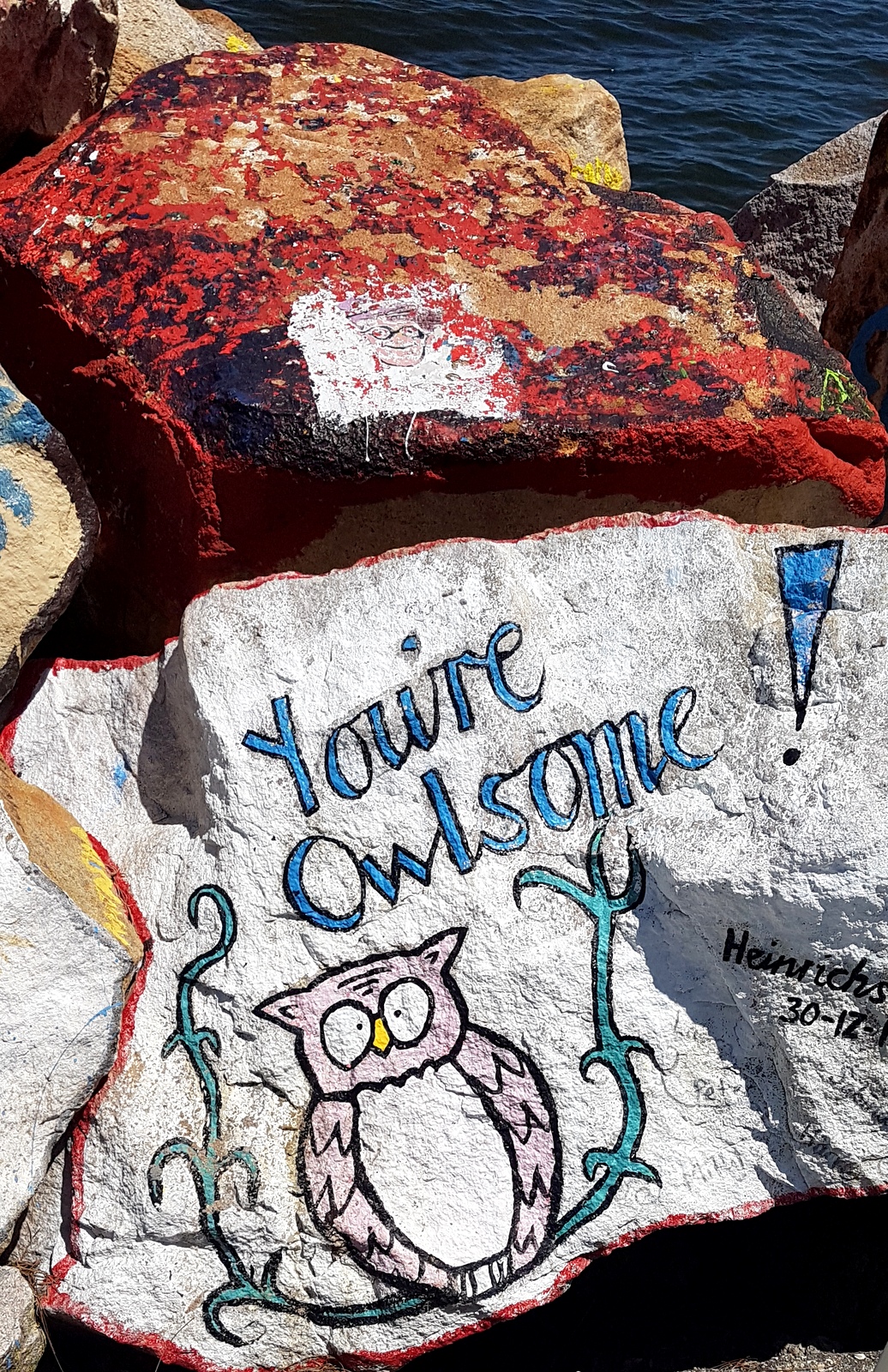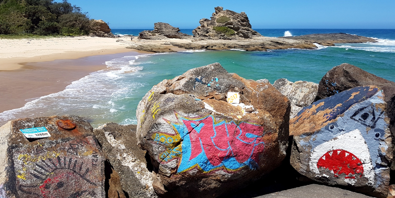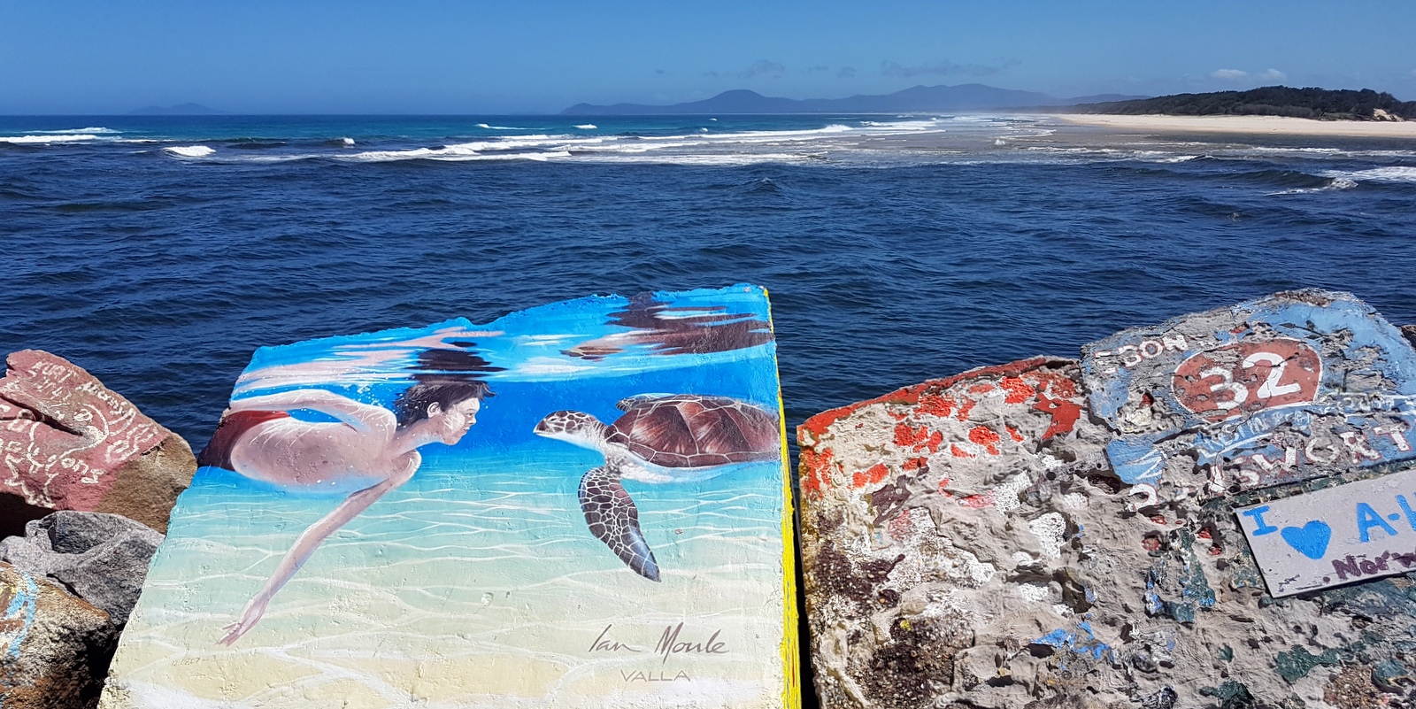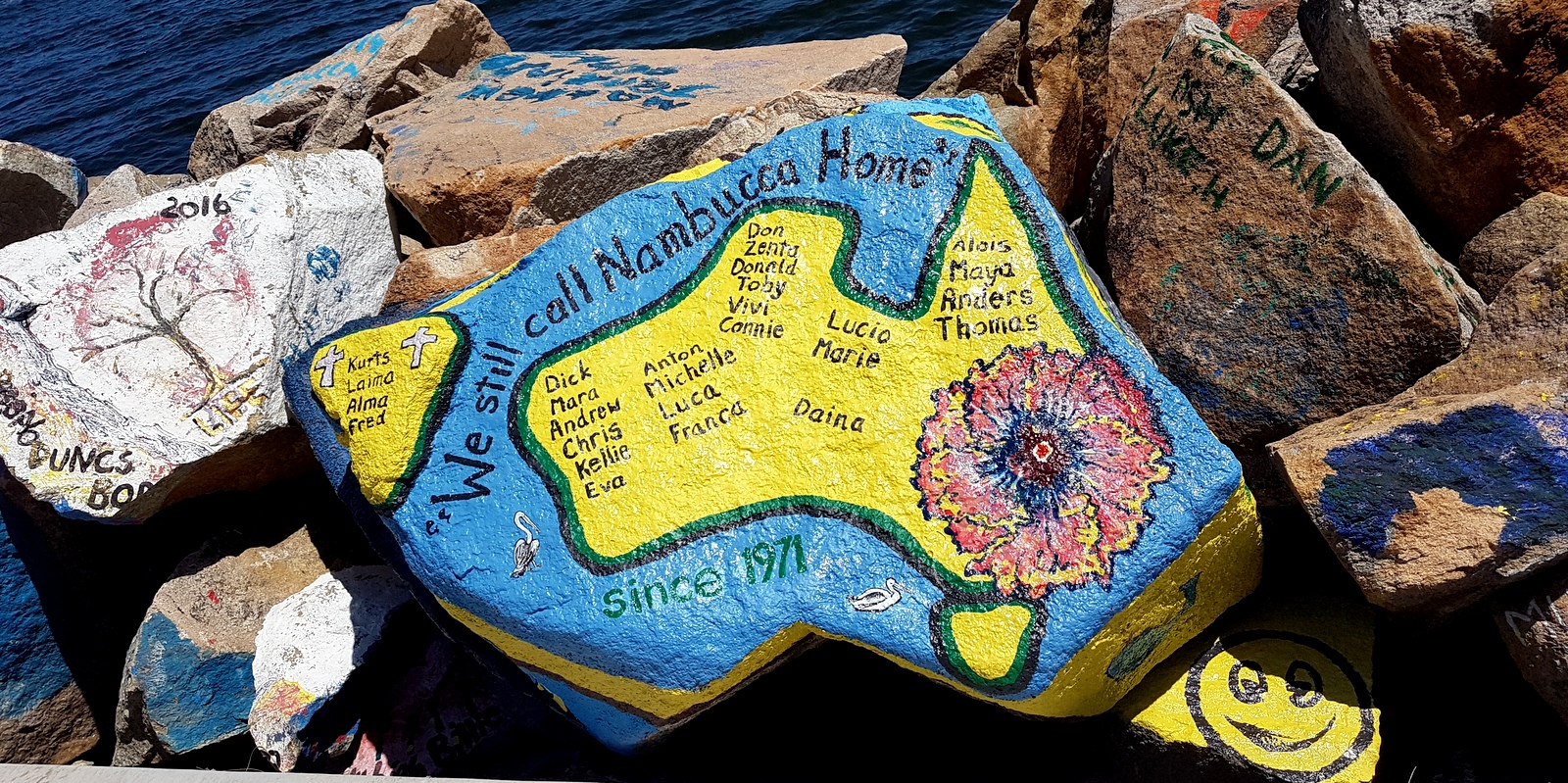 Ce sont des centaines de rochers peints qui longent la jetée de l’embouchure de la Nambucca River. Remerciement, hommage, souvenir de vacances ou juste un délire artistique… chacun est libre de s’exprimer et de laisser sa trace et son inspiration sur un de ces nombreux rochers. Ne vous gênez surtout pas pour laisser la votre, à condition d’apporter le matériel et de trouver un rocher disponible le long de ces 500m de jetée !!!