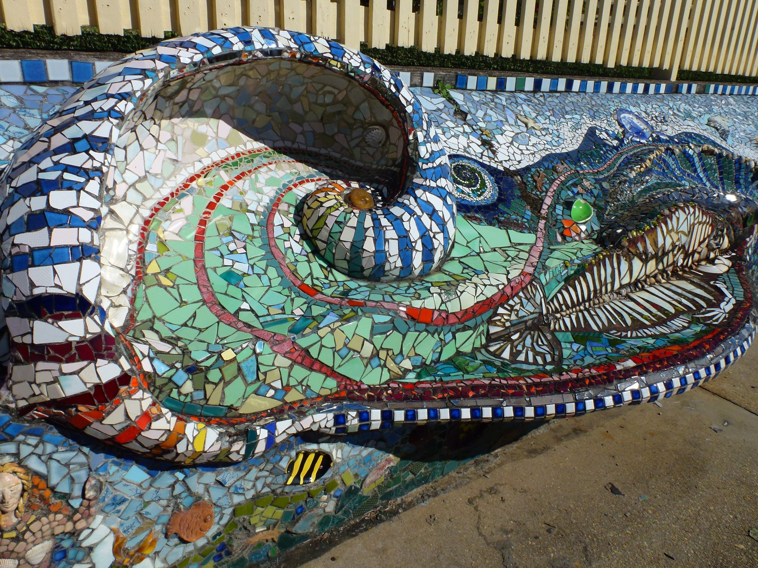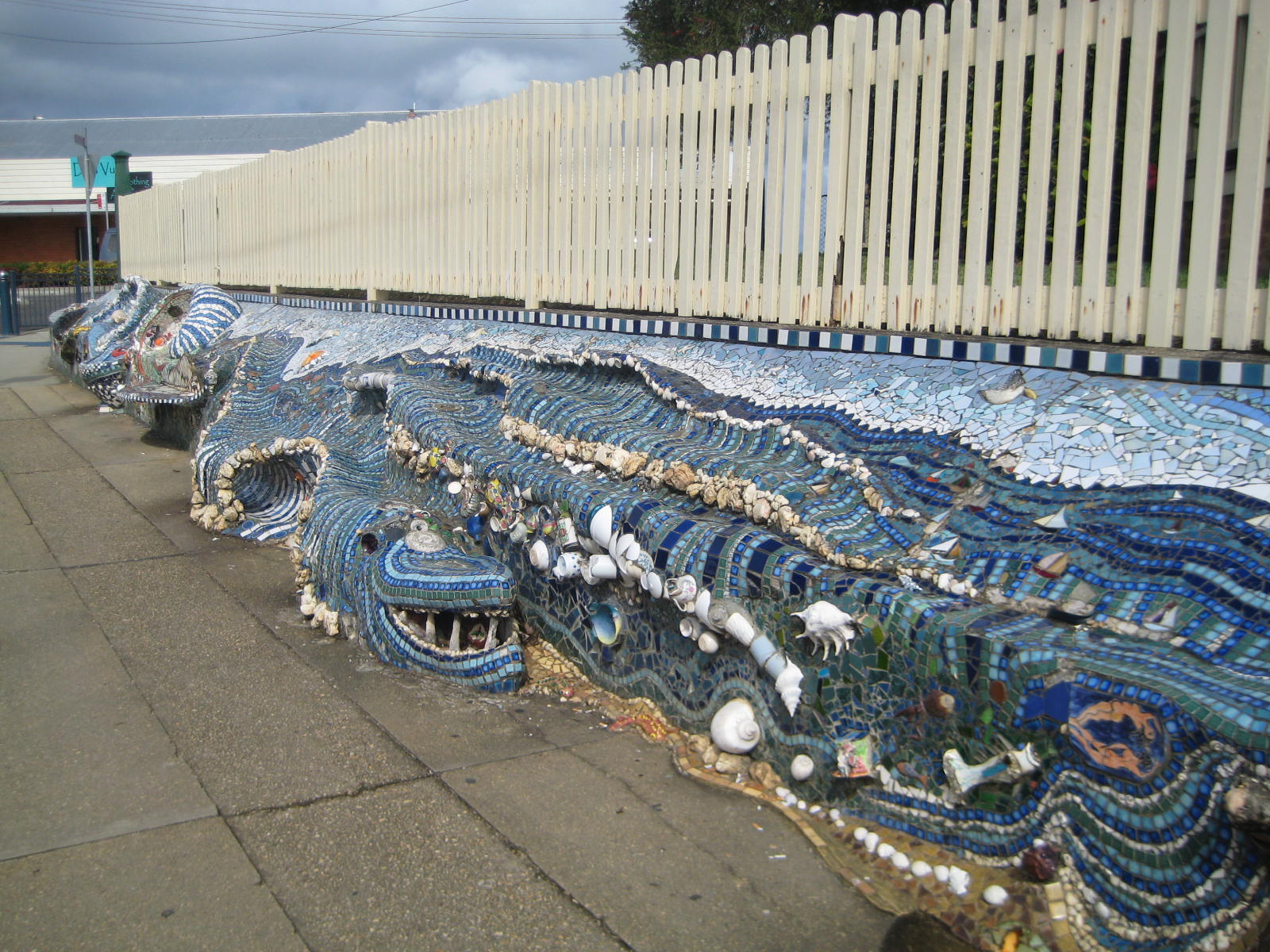 Cette sculpture qui pourrait être la plus longue du pays représente le périple d’une rivière depuis la montagne, à travers les villes et la campagne jusqu’à sa rencontre avec l’océan. On y voit des dauphins, des poissons et même une pieuvre émerger de cette vague de ciment mosaïquée qui a été réalisée par le mosaïste Guy Crosley et des artistes locaux.