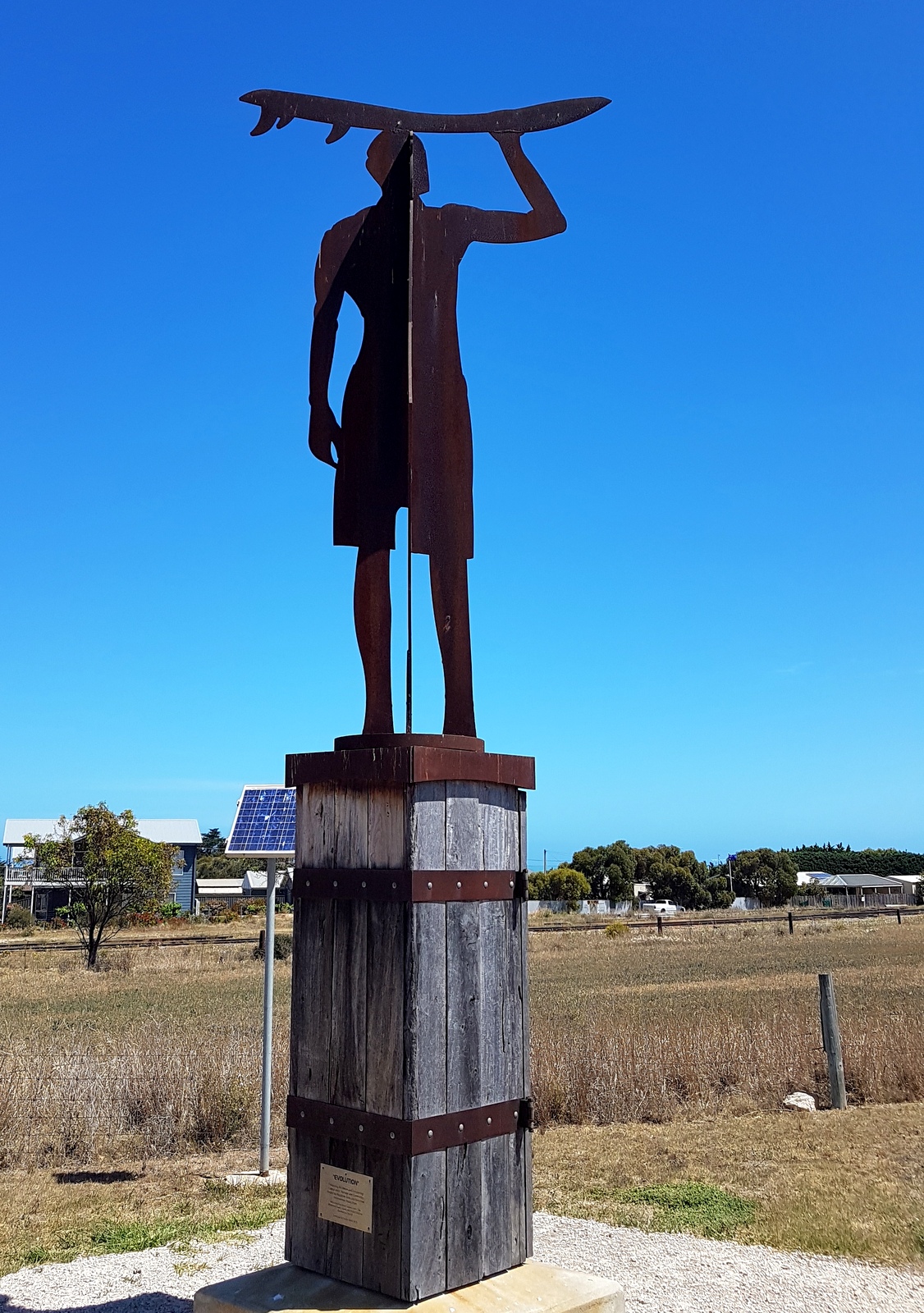 Middleton est un spot de surf réputé et ça se remarque de suite avec une sculpture étonnante, qui change suivant l’angle de vision: une femme avec une planche de surf sous le bras ou un homme avec la planche sur la tête, qui trône à une intersection!!!