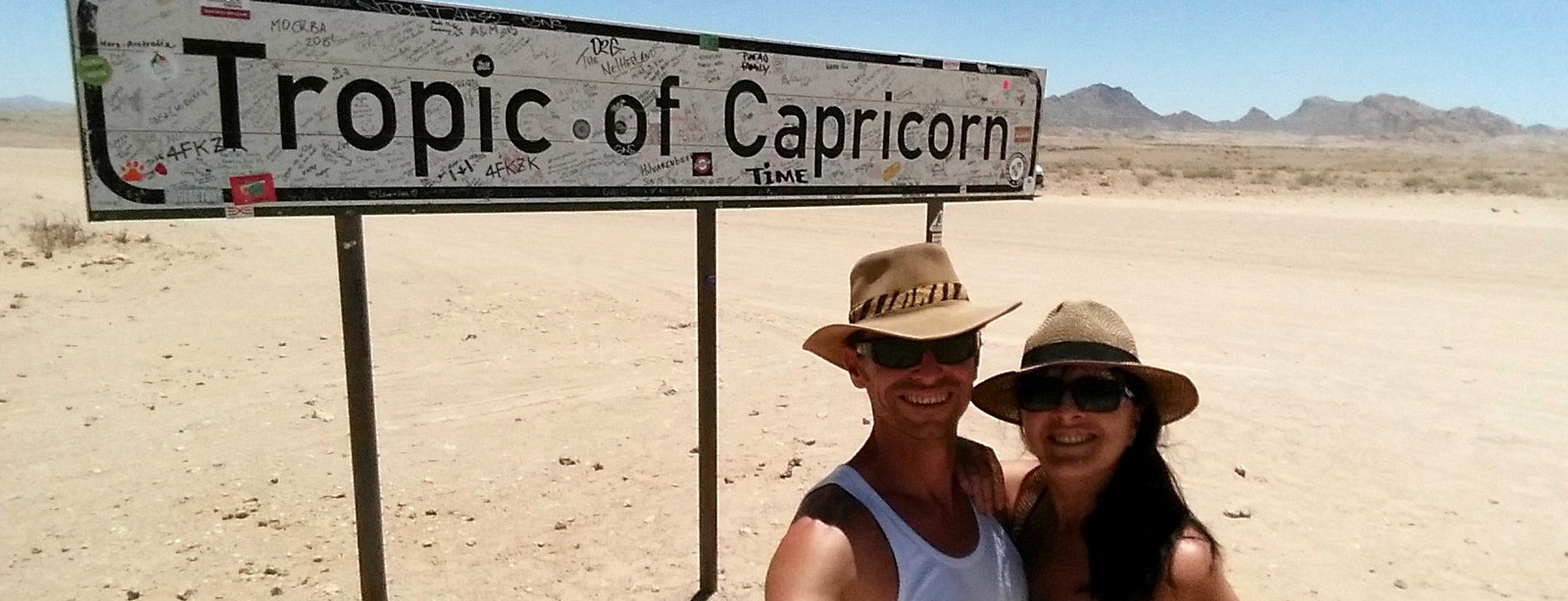 Environ 1h après Solitaire, on croise le tropique du capricorne matérialisé par une pancarte… Evidemment, comme tout le monde, on s’arrête pour la photo… en se disant qu’enfin on ne le confondra plus avec le tropique du cancer !!!