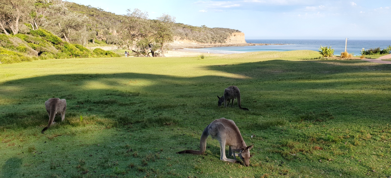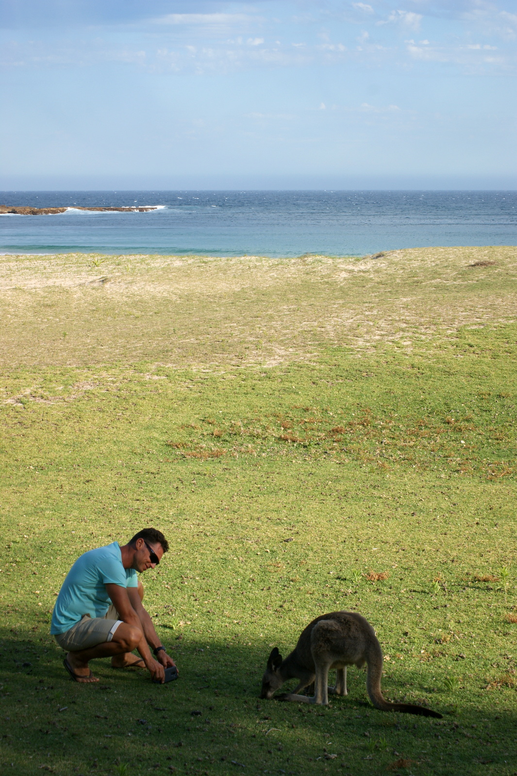 Imaginez… une plage magnifique de sable blanc bordée par une végétation digne du jardin d’Eden: une « pelouse », des arbustes, des lys sauvages partout qui embaument… et on rajoute au tableau: des kangourous, peu farouches, qui se baladent librement au milieu de nuées de perruches arc-en-ciel… Une vraie vision de paradis !!!