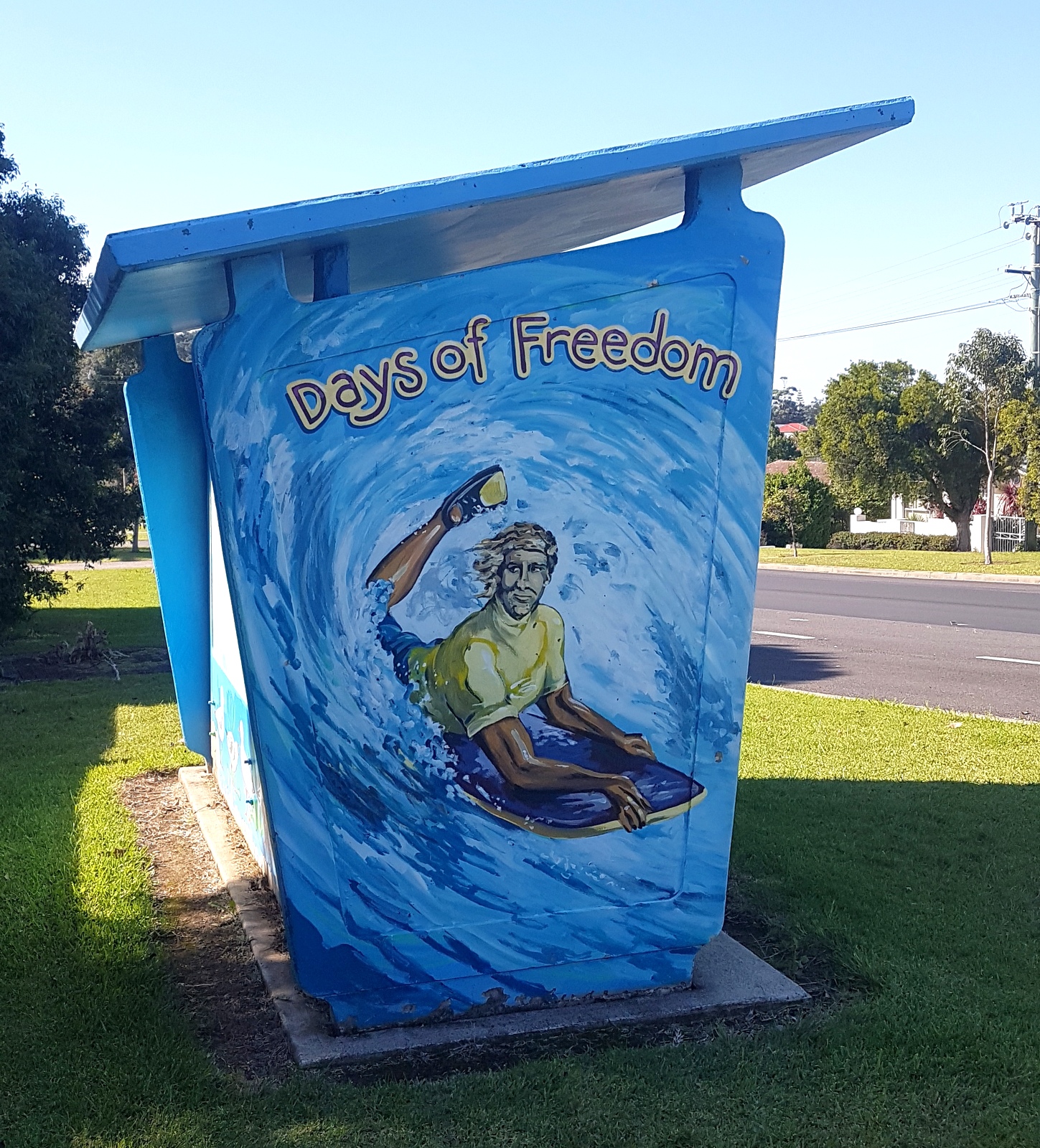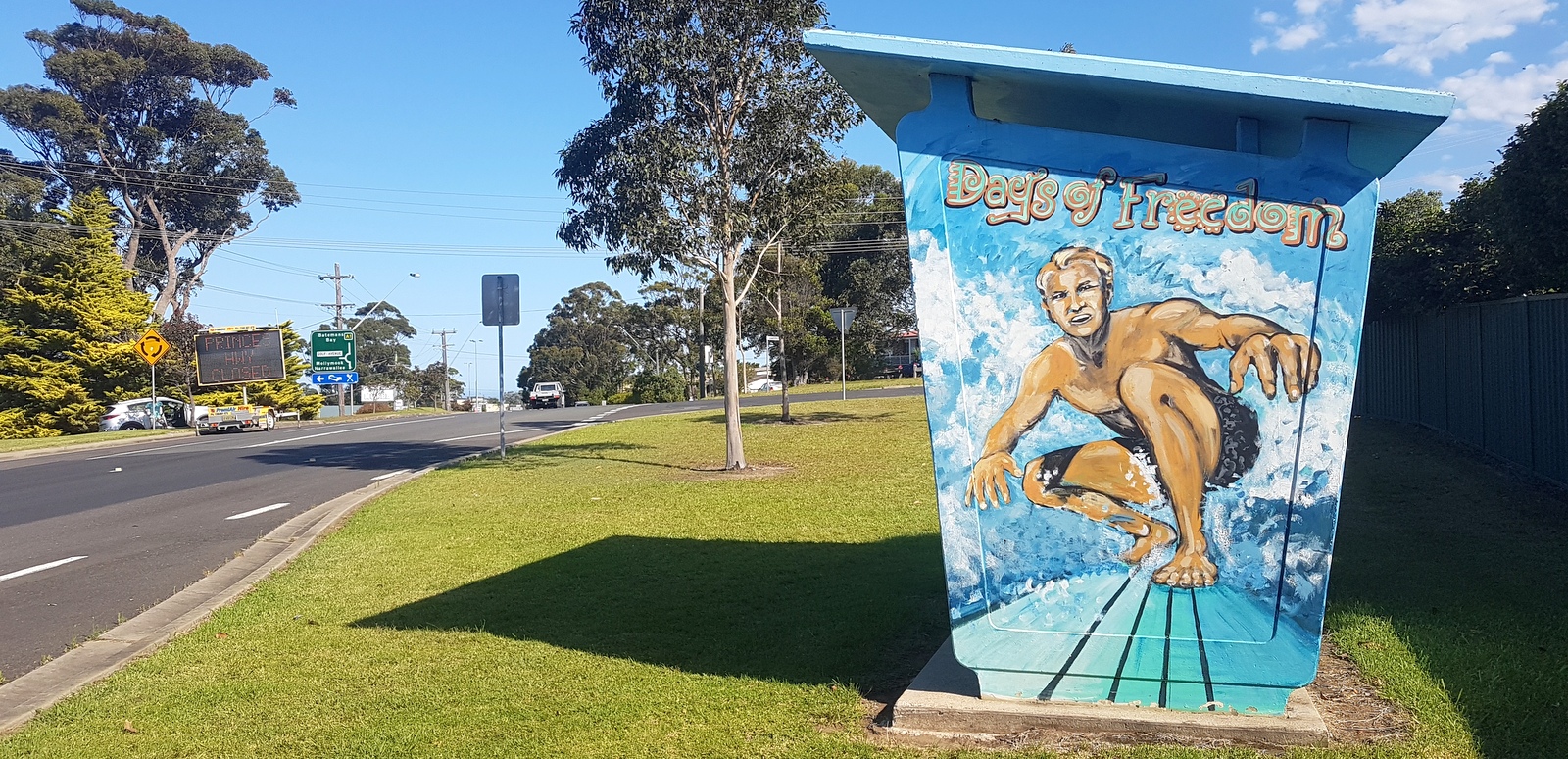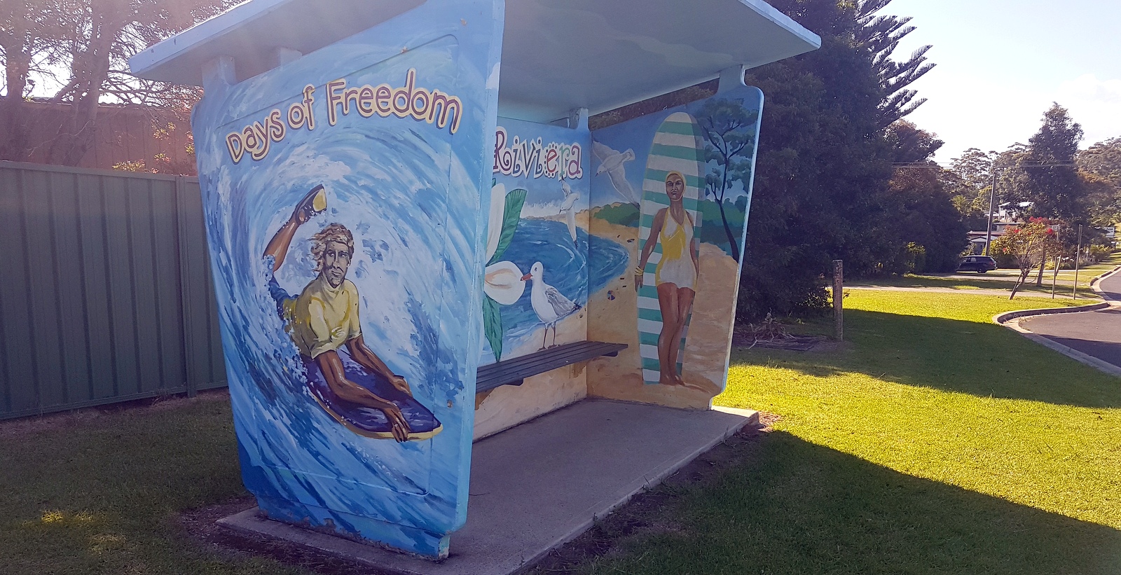 C’est vraiment à grands regrets qu’on continue notre route…  On traverse BATEMANS BAY où on croise cet abribus  magnifiquement décoré…