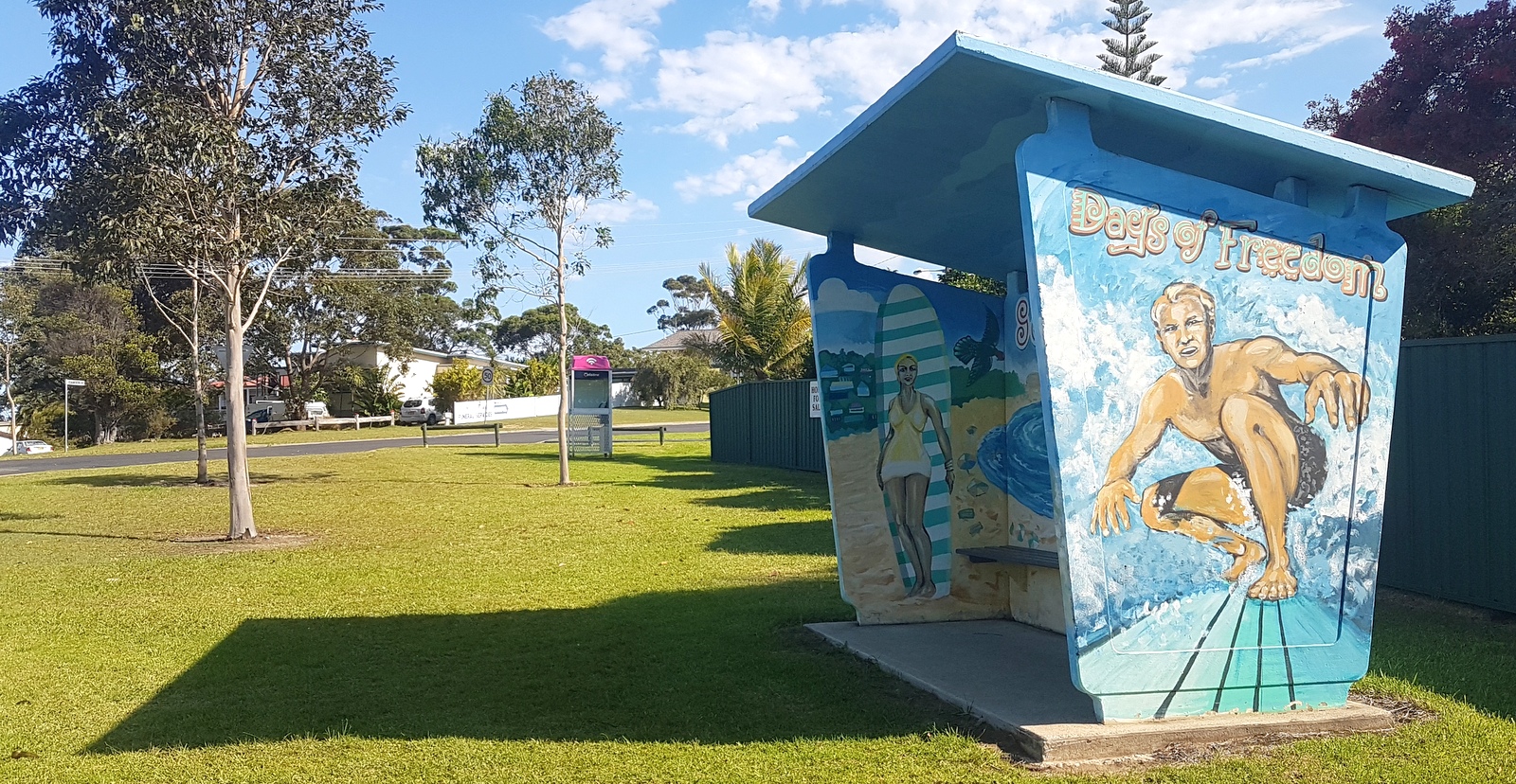 C’est vraiment à grands regrets qu’on continue notre route… On traverse BATEMANS BAY où on croise cet abribus magnifiquement décoré…