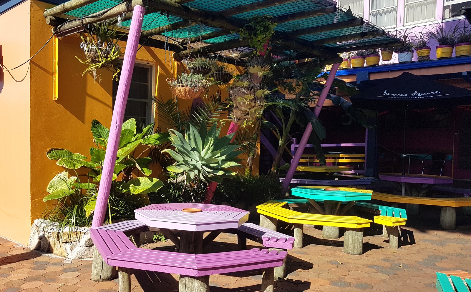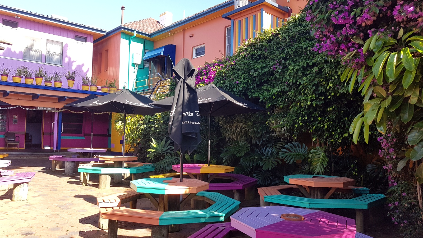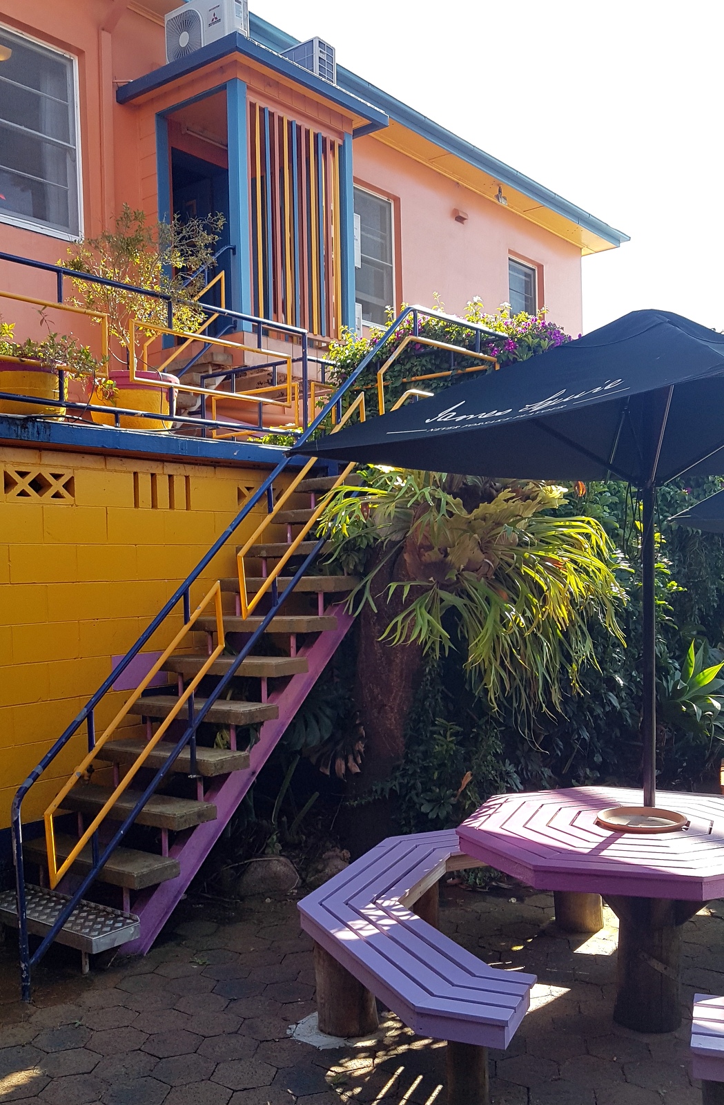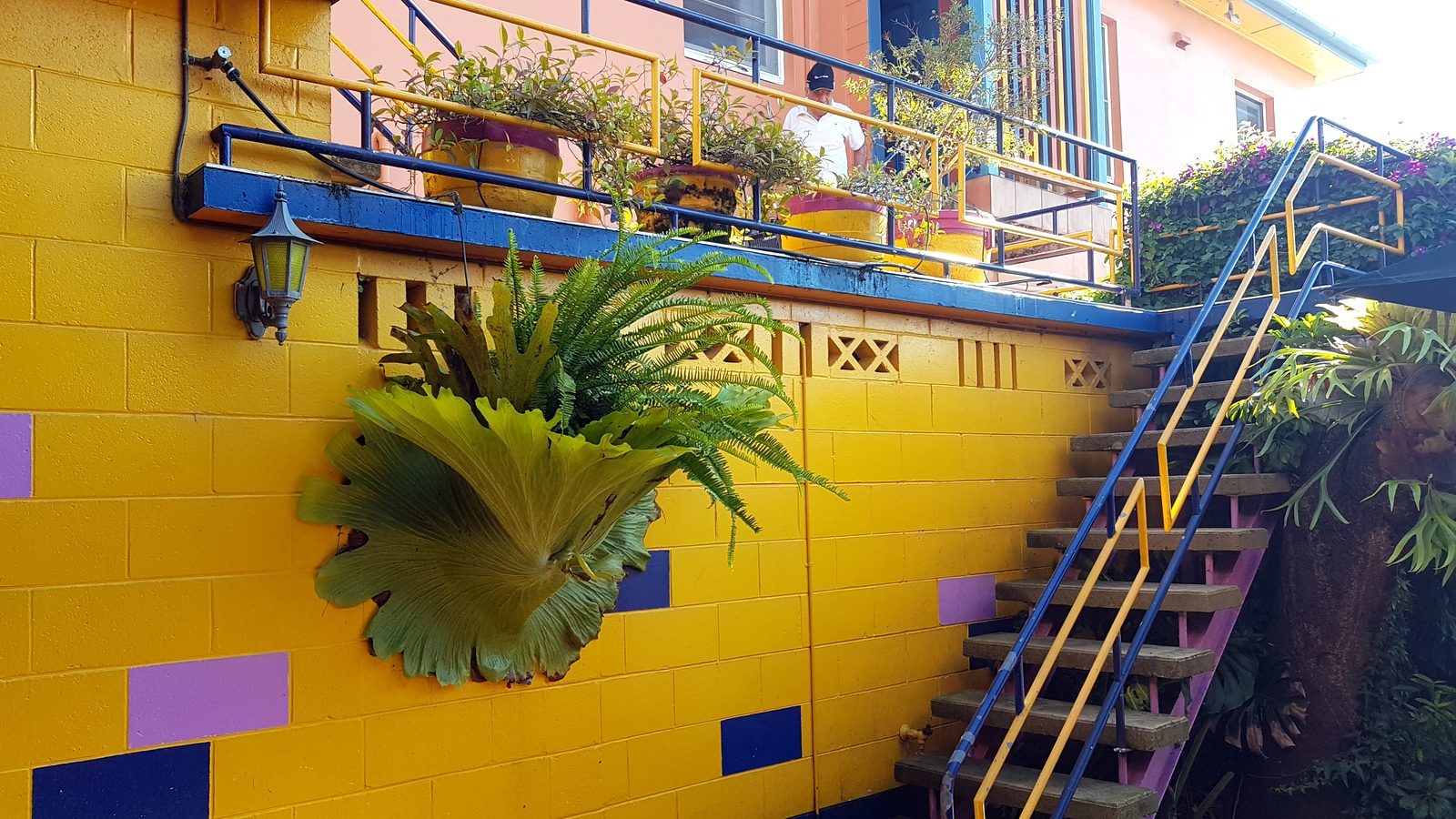 En fait si rien n’a changé dans le bâtiment, les propriétaires s’en sont donné à cœur joie dans l’arrière cour qui est peinte dans des couleurs vives ce qui lui donne un petit air tropical étonnant…