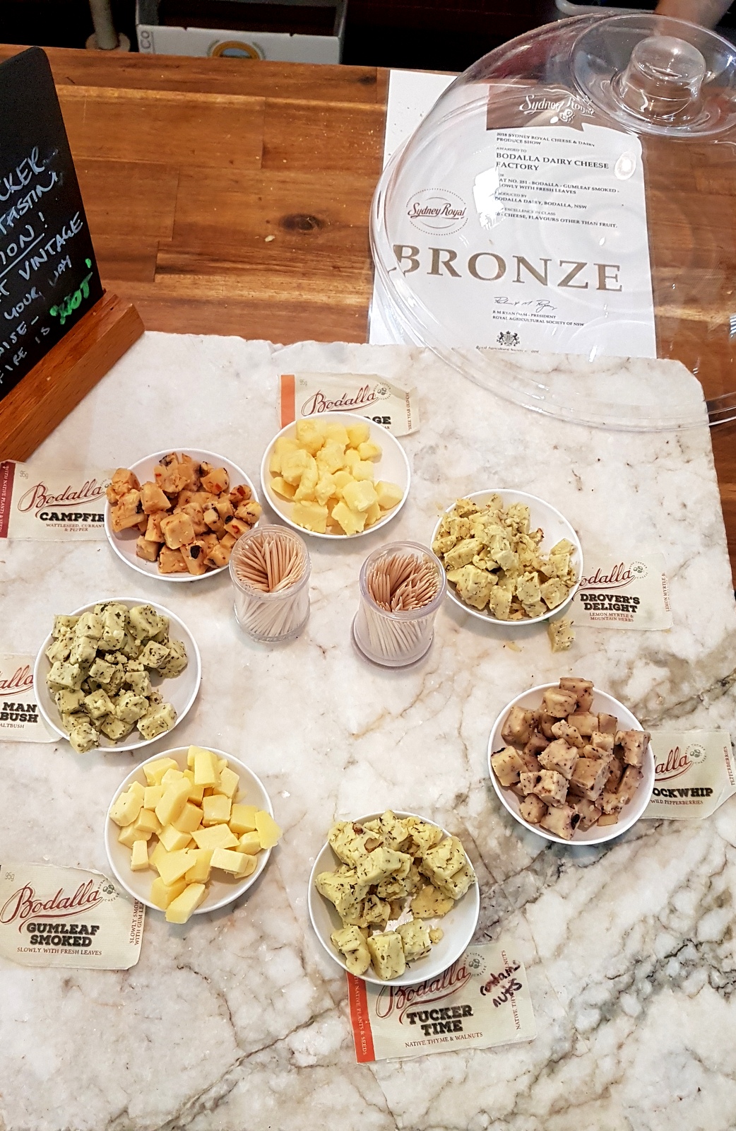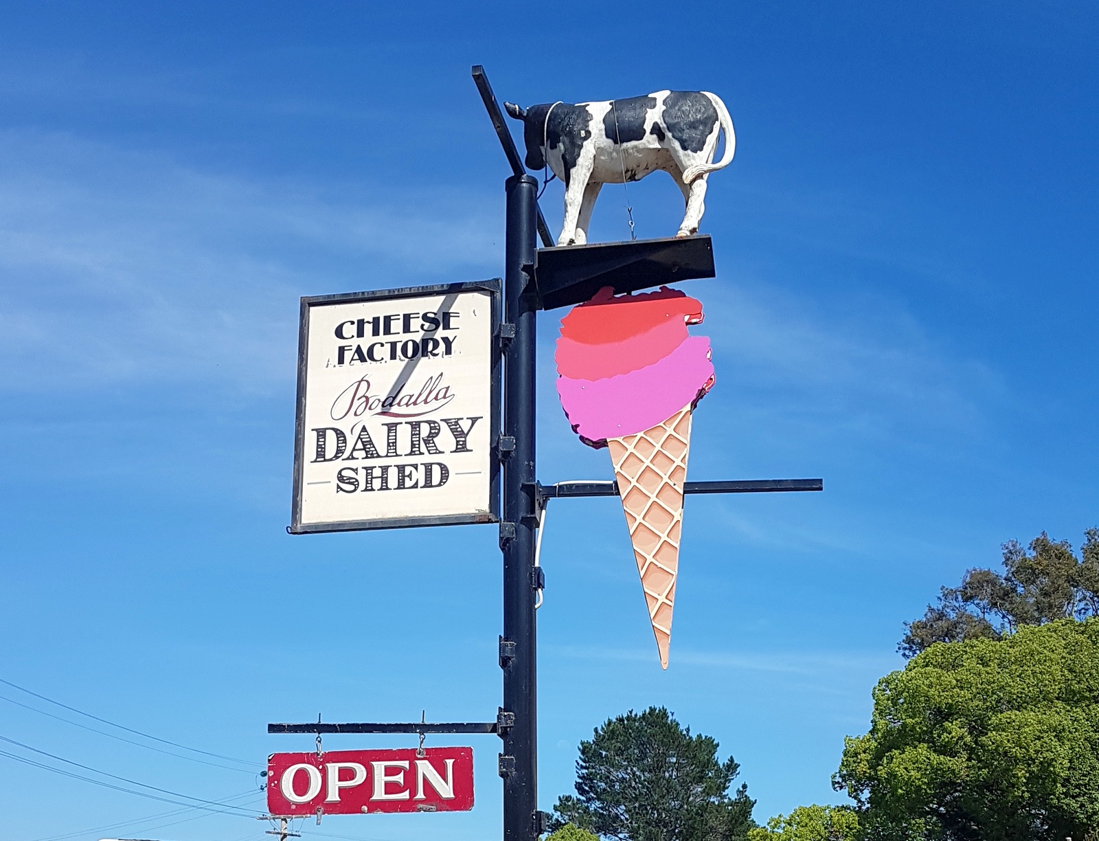 Notre 1ère étape est à Bodella pour visiter la fabrique de fromages, BODELLA DAIRY SHED, qui perpétue la méthode traditionnelle de traite de son bétail, commercialise son lait frais et ses fromages maison. Ce sont des pâtes cuites parfumées (6 parfums) avec des ingrédients typiquement australiens (des feuilles, des baies…) qui nous ont si inconnus qu’il est difficile de choisir… Heureusement, des plateaux de dégustation gratuits permettent de découvrir toutes ces saveurs souvent inédites et de se décider. On était en manque de fromage, c’est sûr, mais on les a trouvés plutôt bons ces fromages, largement au dessus des goudas !!!