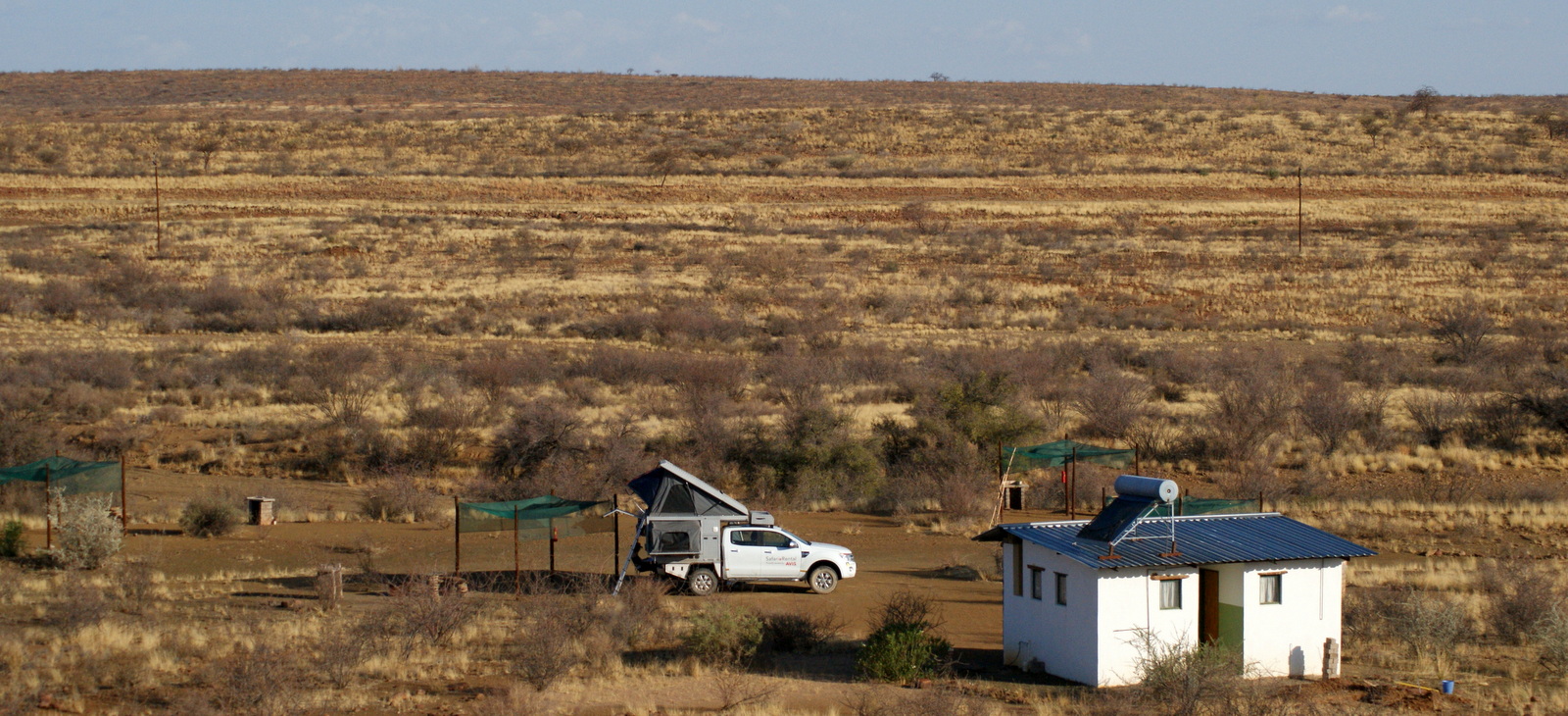 On hésite entre le CAMP GECKO et son fabuleux emplacement « Eagle Camp » ou le CAPRICORN REST CAMP pour passer la 1ère nuit. On est partis trop tard plus tard que prévu de Windhoek, on préfère donc ne pas passer tout de suite à Solitaire (tout proche) et le CAPRICORN est plus près alors dès qu’au milieu de nulle part, une pancarte nous indique l’entrée du CAPRICORN sur la droite, on tourne… On n’a pas réservé mais comme on est les seuls, pas de souci pour choisir notre emplacement préféré !!!