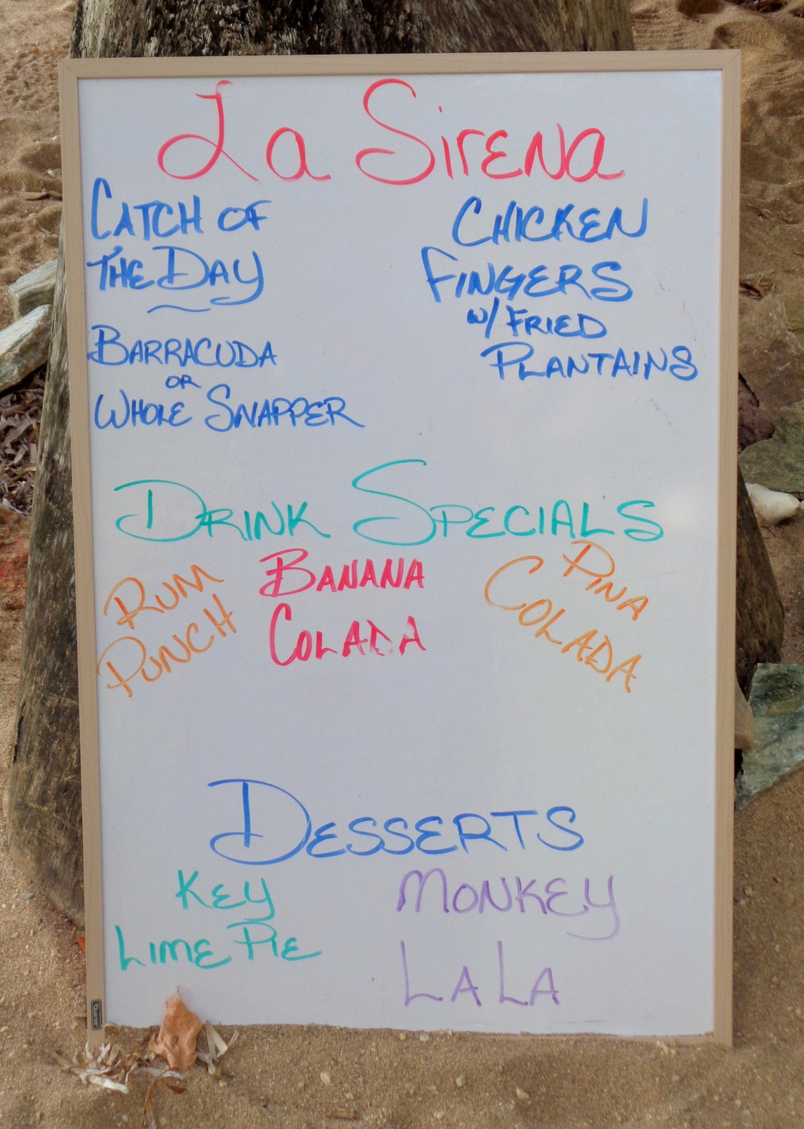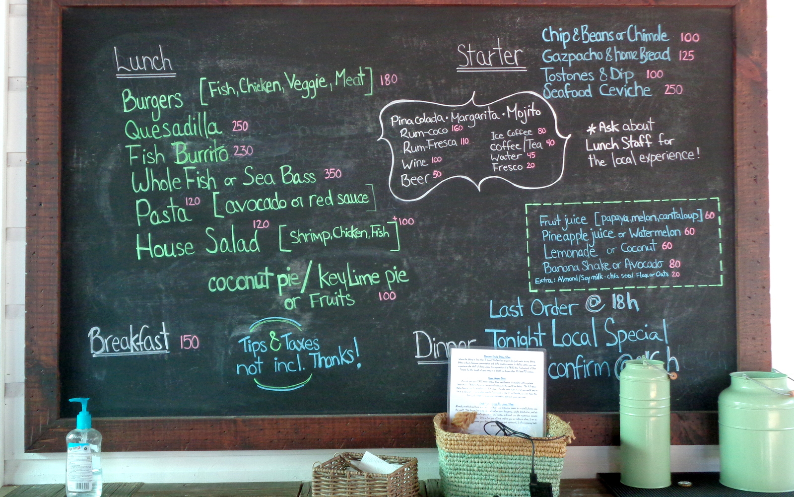 Il y a un menu du soir à 250 HNL (environ 12$) comprenant un plat et un dessert, sinon le menu à la carte est disponible sur un tableau. Nous avons beaucoup aimé les ceviches, les pâtes à la tomate ou à l’avocat, le fish burger, le gaspacho…