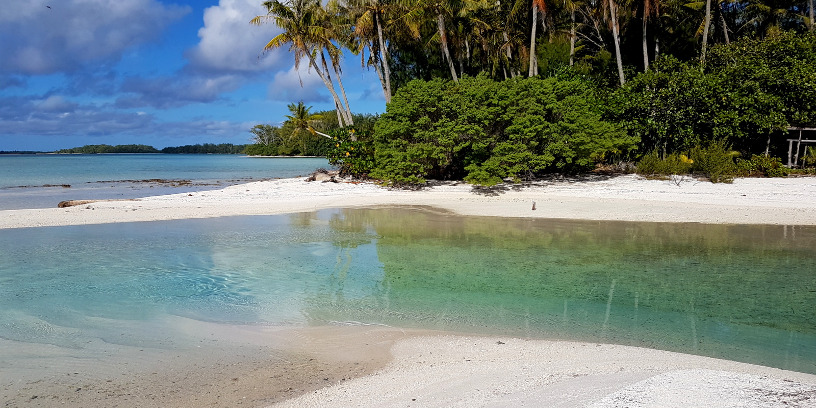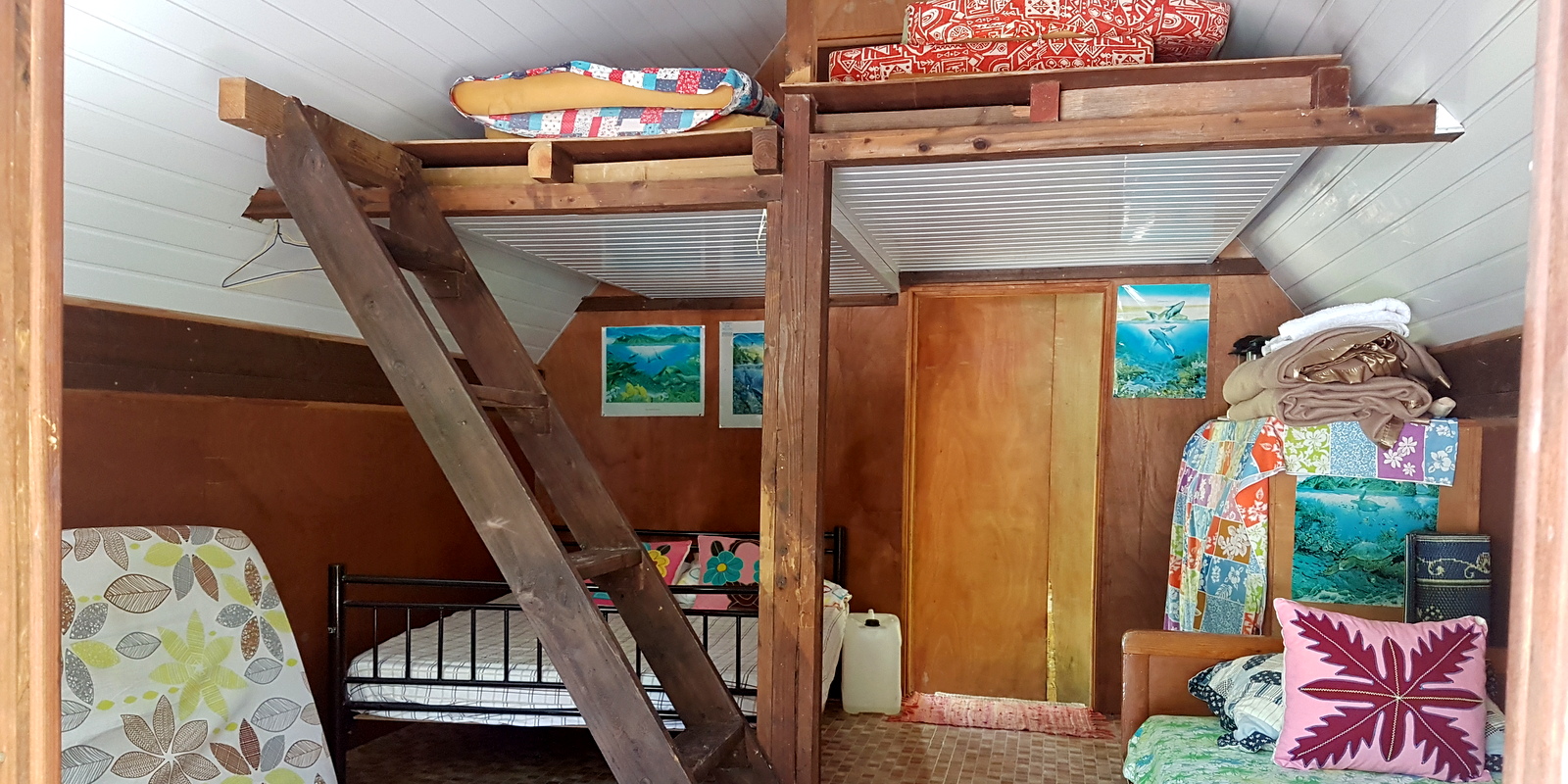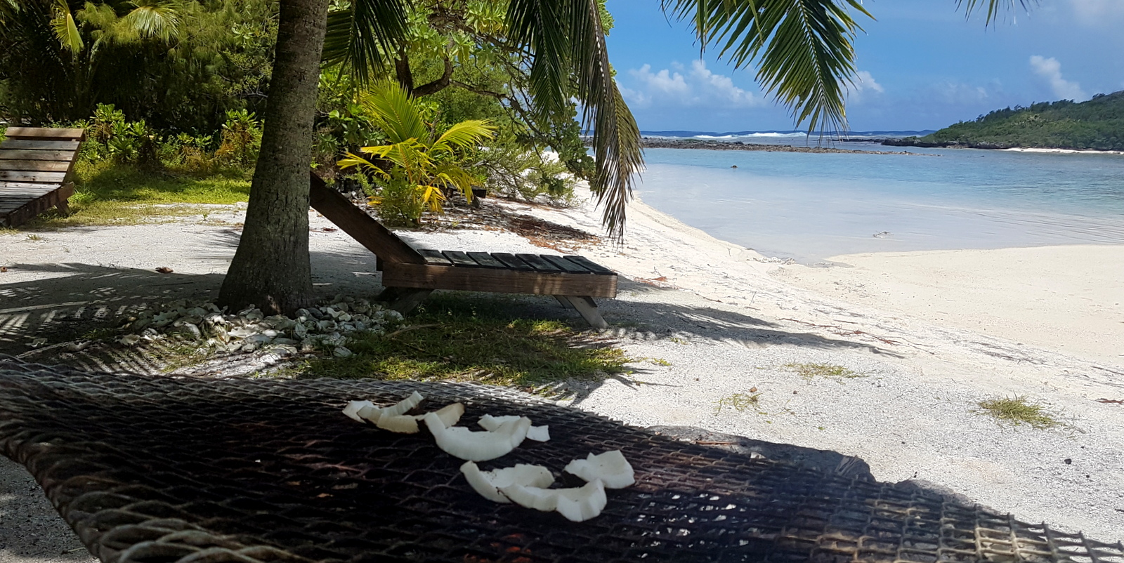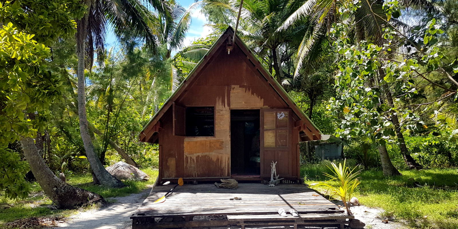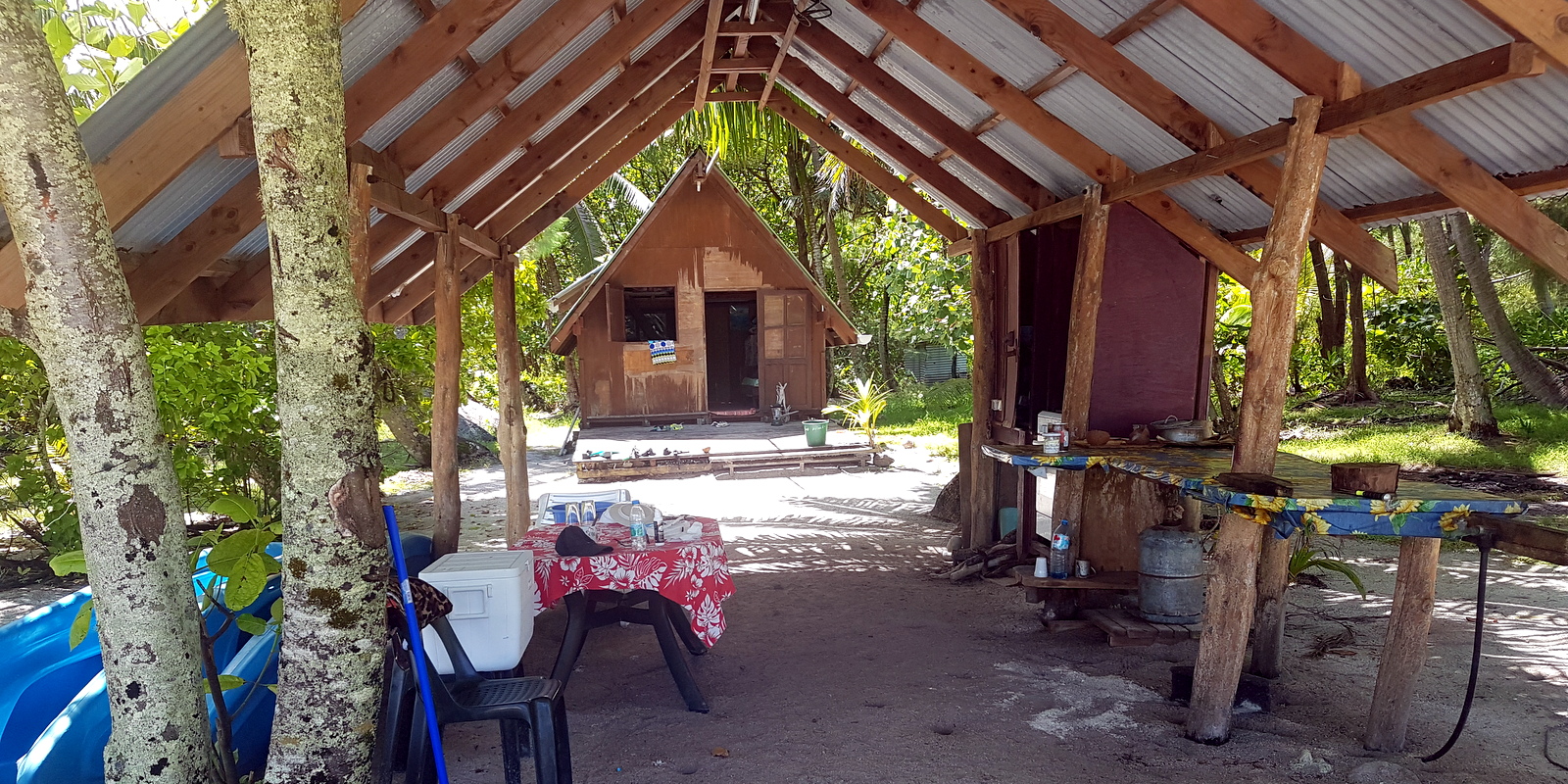 Arrivés sur le motu, on s’installe… La cabane est grande, il y a une foultitude de matelas sur la mezzanine et un lit de 2 places. Dennys nous a déjà informés qu’on peut sortir un matelas et dormir sur la plage comme eux le font avec sa femme quand ils y vont… Quelques dernières recommandations sur l’utilisation de la gazinière, du four, des toilettes qu’il faut vider avec un seau d’eau de mer, de la douche (une grande bassine alimentée par une citerne avec une écope pour s’arroser…), la pêche des bénitiers (un peu technique et on n’a trouvé aucune info sur internet!) et nous voilà tout seuls avec une glacière contenant le repas pour le soir et de quoi se faire le petit déj du lendemain !!!