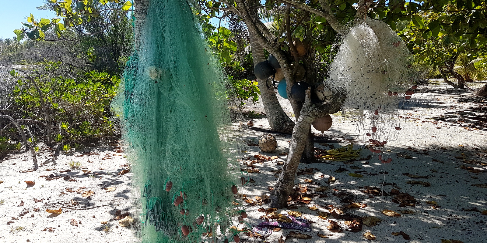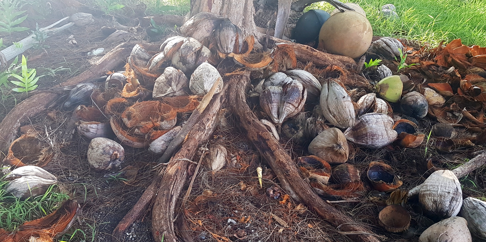 On trouve de nombreuses noix de coco sur le motu et on est bruyamment averti dès qu’il y en a une qui tombe de son arbre. Elles sont toutes comestibles et on peut les utiliser à tous les stades de maturation: