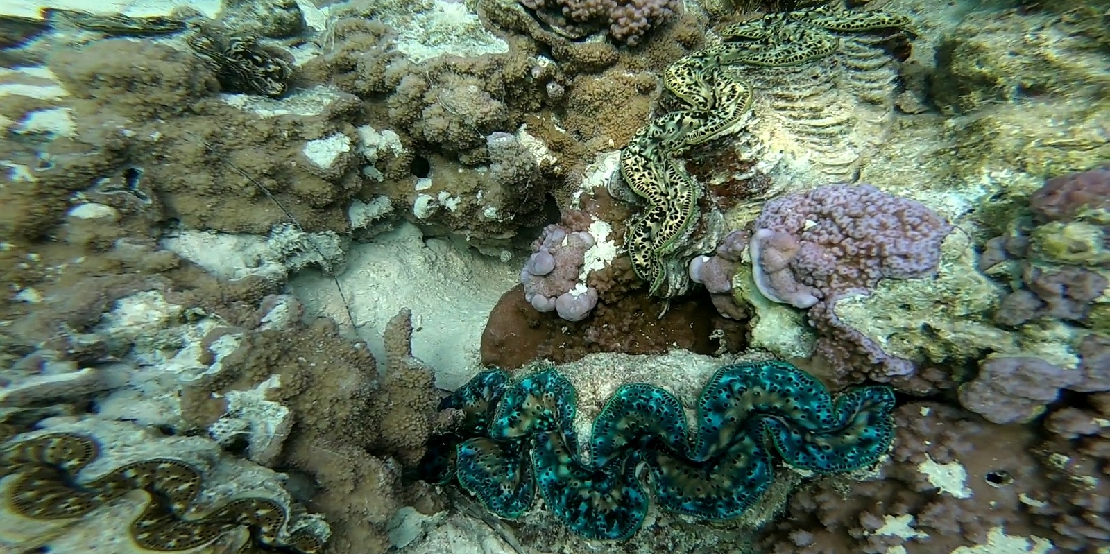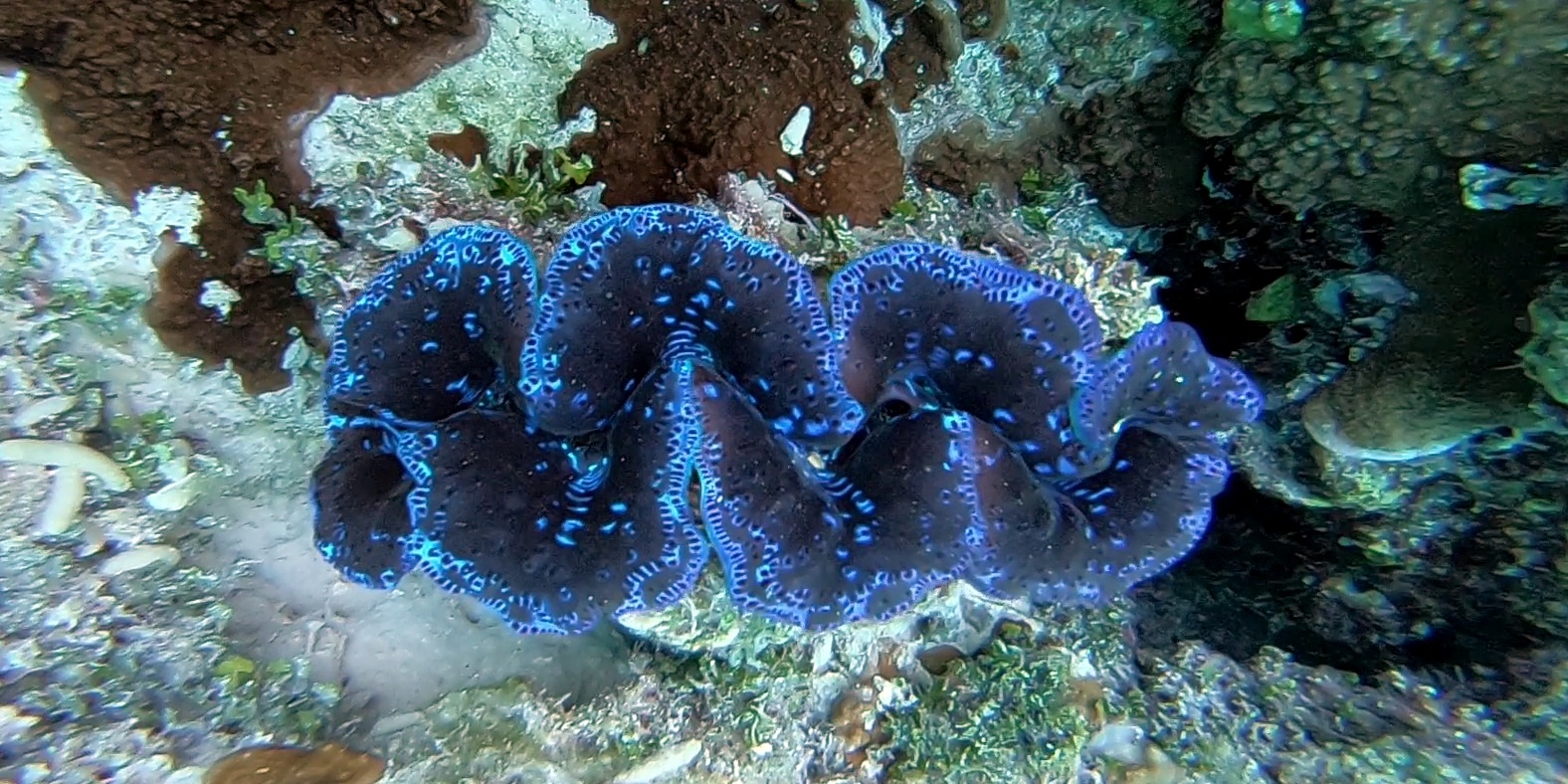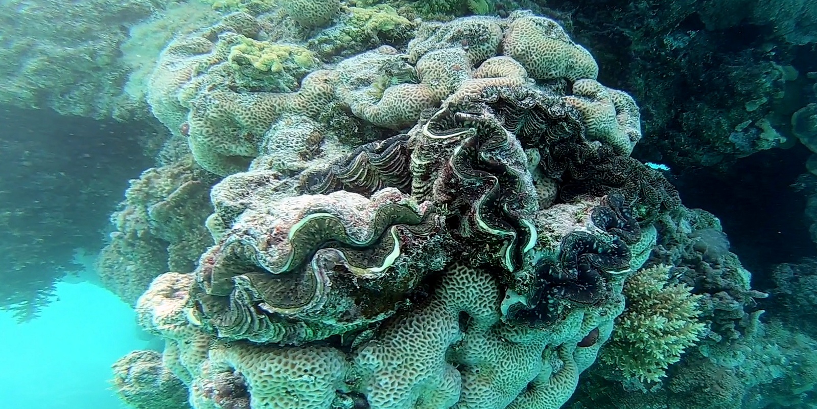 – le bénitier est accroché au récif par un pied, un muscle, qu’il faut détruire en enfonçant le tournevis à travers (photo 1). S’il se ferme à votre approche, attendre qu’il s’entrouvre ou passez à un autre. Il faut ensuite remuer le tournevis de manière circulaire jusqu’à ce que le coquillage se décroche! Bizarrement, il y en a qui se décrochent très vite et d’autres qui résistent et qu’il faut travailler pendant quelques minutes et de façon plutôt énergique. Il vaut mieux donc s’attaquer à ceux qui sont dans peu de profondeur à moins d’être un champion d’apnée !!!